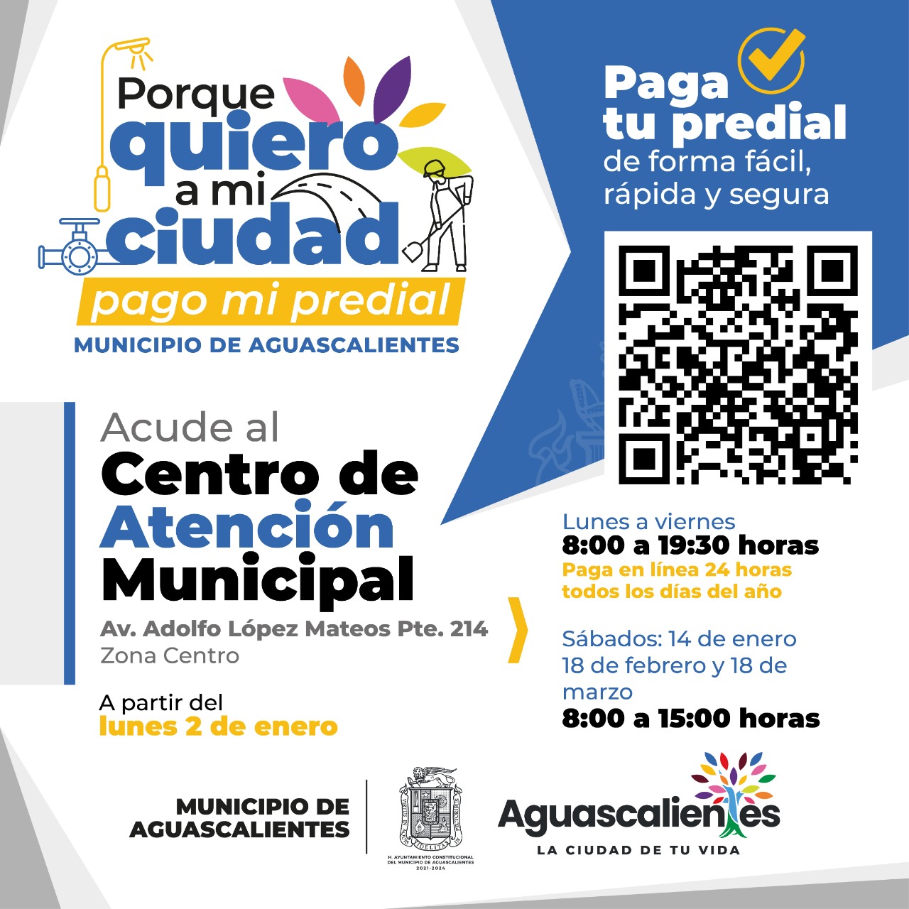 Sergio Arturo Lozano mencionó que para brindar un mejor servicio a la ciudadanía que acude a realizar su pago, el Centro de Atención Municipal (CAM) abrirá sus puertas el primer trimestre del año de 8:00 a 19:30 horas, de lunes a viernes. Además estará en servicio los sábados 14 de enero, 18 de febrero y 18 de marzo, de 08:00 a 15:00 horas. Se dará atención especial a personas con discapacidad y adultos mayores.