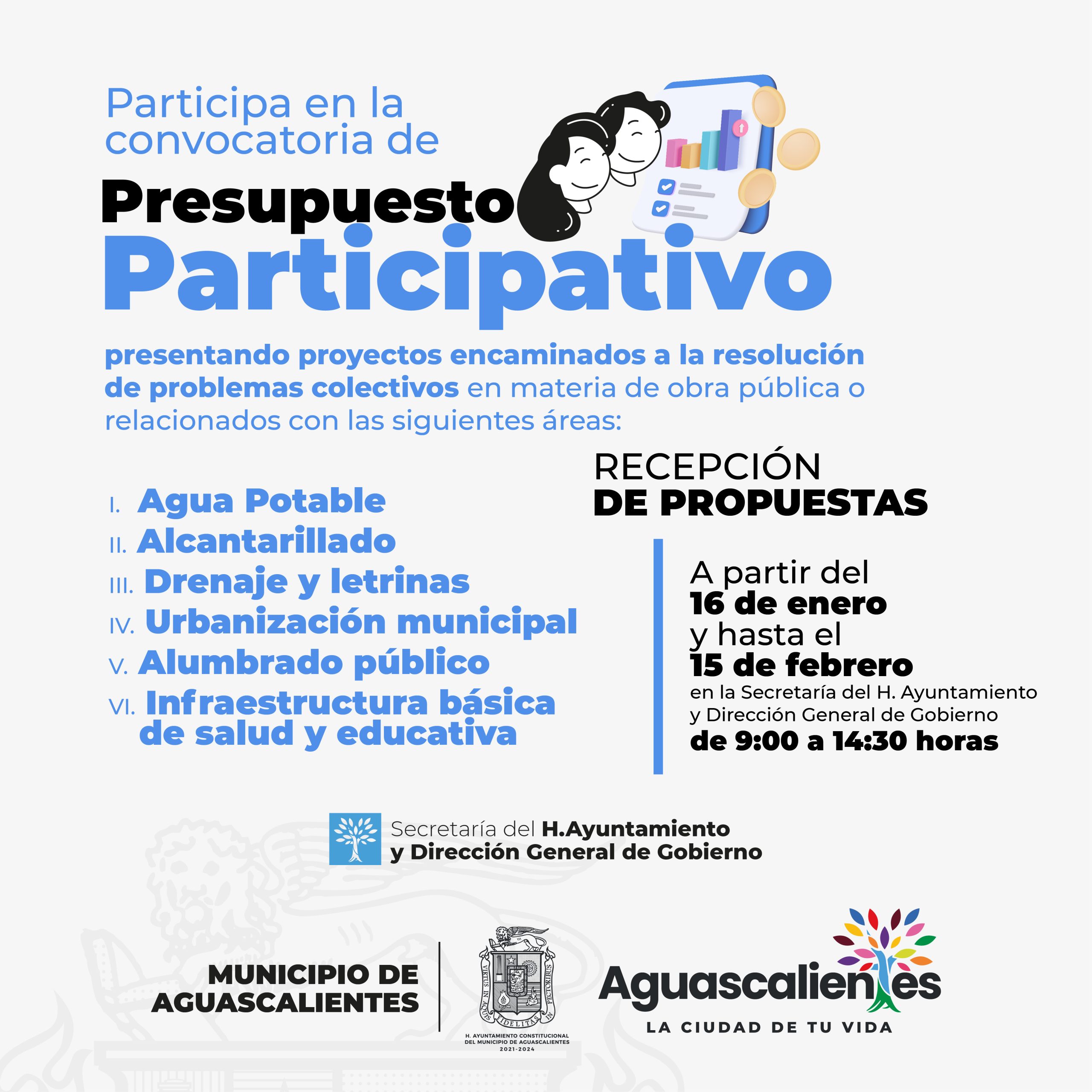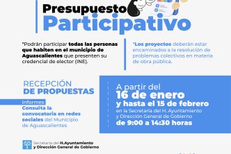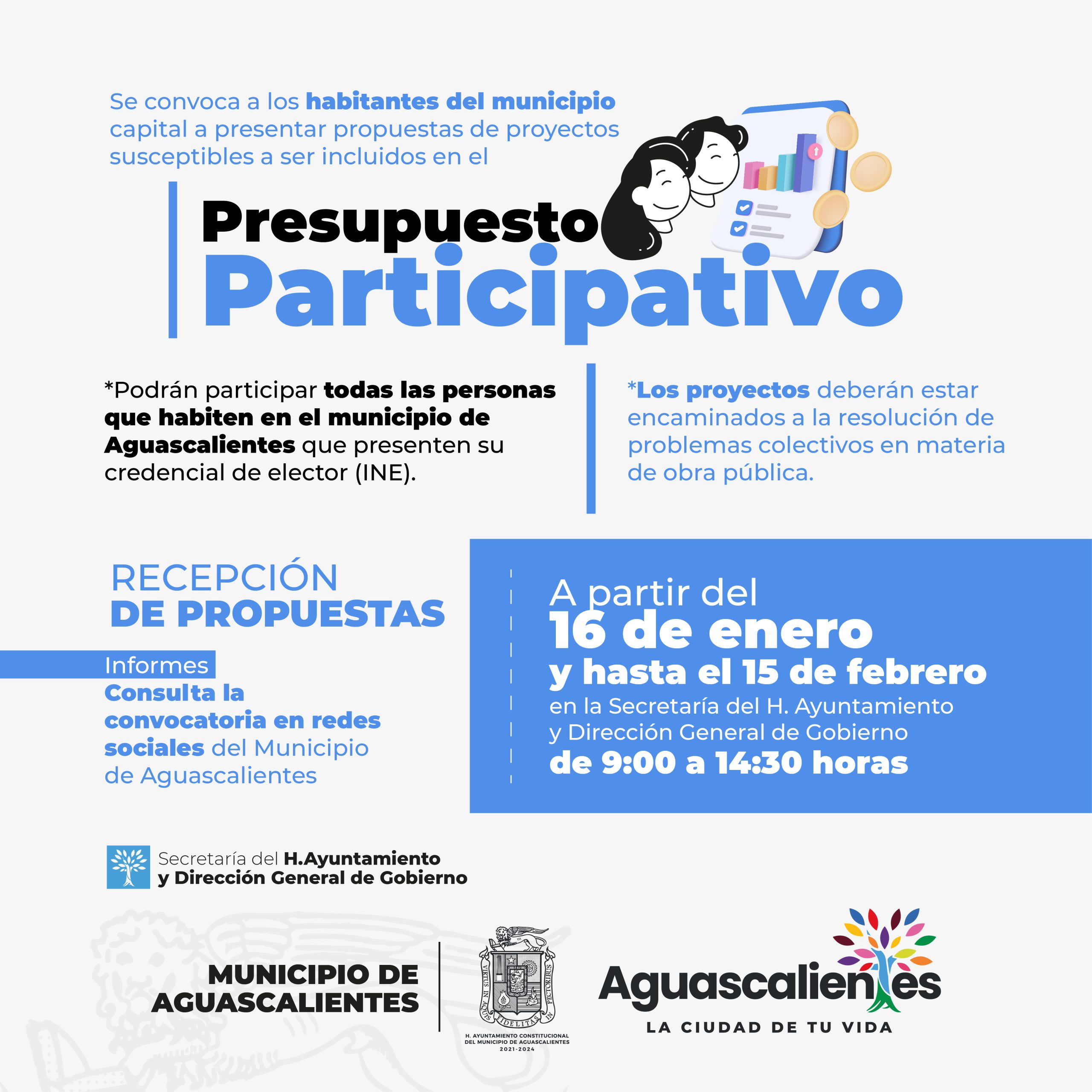 Podrán participar todas las personas que habitan el municipio de Aguascalientes, tendrán un plazo de 30 días para presentar sus proyectos, desde el día 16 de enero y hasta el 15 de febrero del año en curso, se recibirán las propuestas en la Secretaría del H. Ayuntamiento y Dirección General de Gobierno de lunes a viernes, de 9:00 a 14:30 horas.
