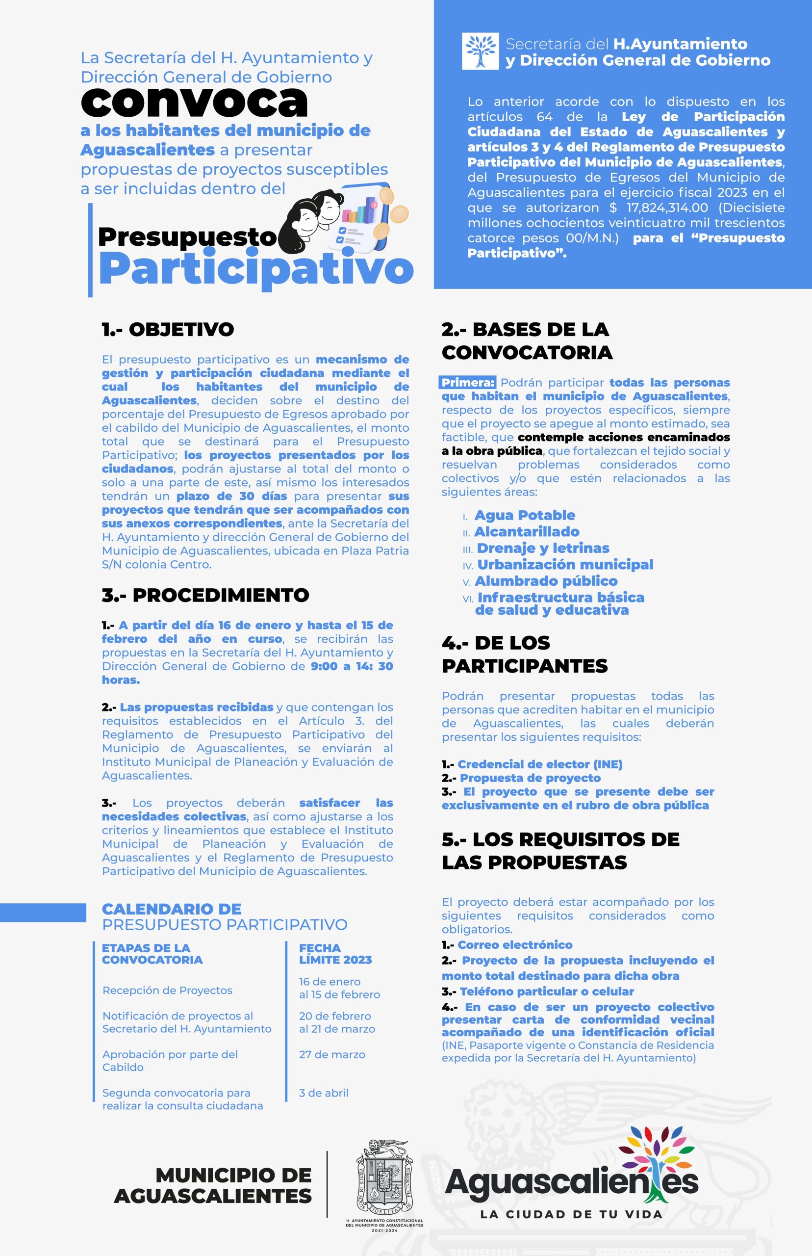 La Secretaría del H. Ayuntamiento y Dirección General de Gobierno convoca a los habitantes del Municipio de Aguascalientes a presentar propuestas de proyectos adecuados a ser incluidas dentro del presupuesto participativo.