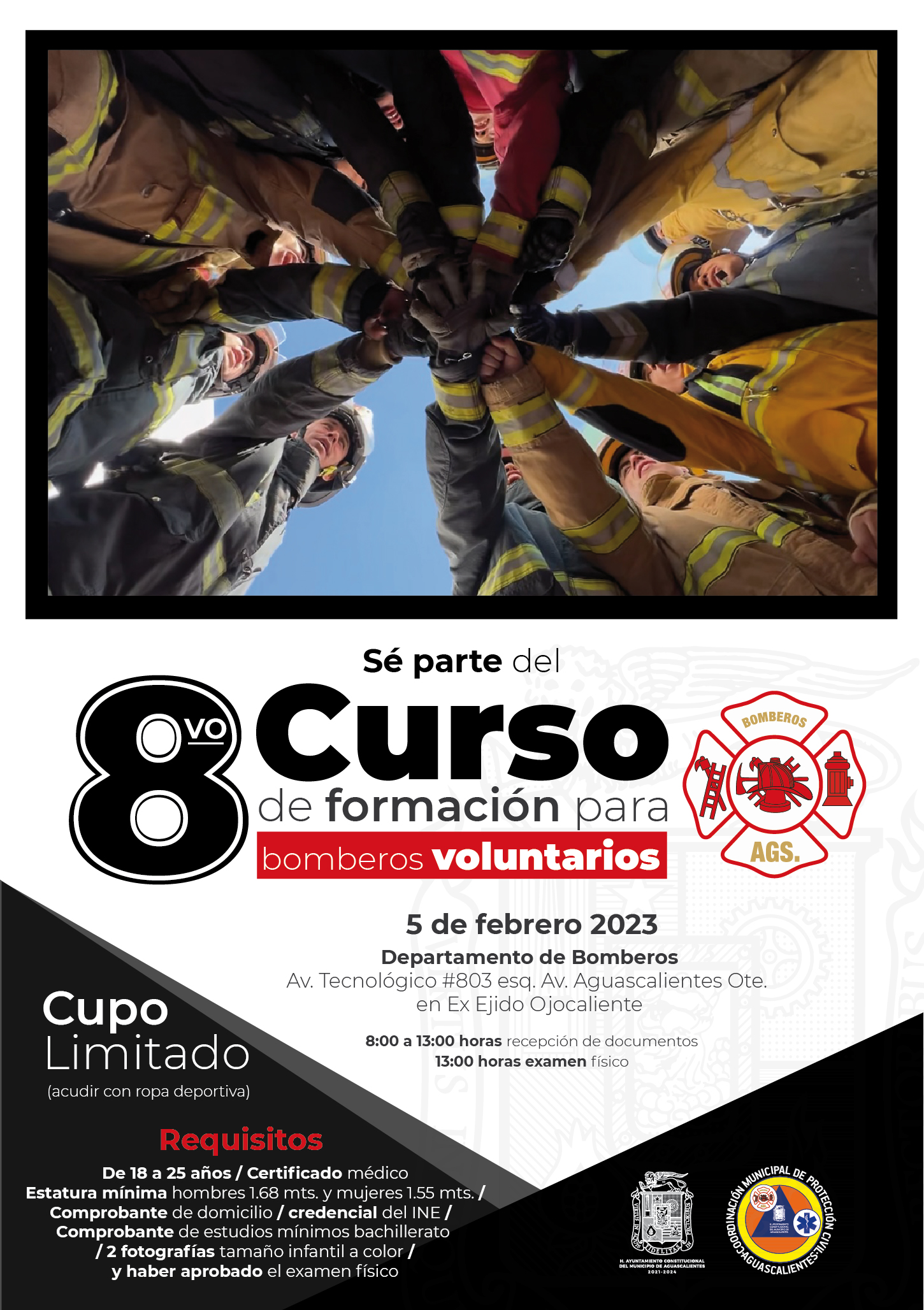 La Coordinación Municipal de Protección Civil a través del Heroico Cuerpo de Bomberos del Municipio de Aguascalientes, pondrá en marcha el Octavo Curso de Formación para Bomberos Voluntarios, el cual tendrá un cupo limitado para 50 aspirantes.