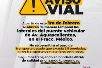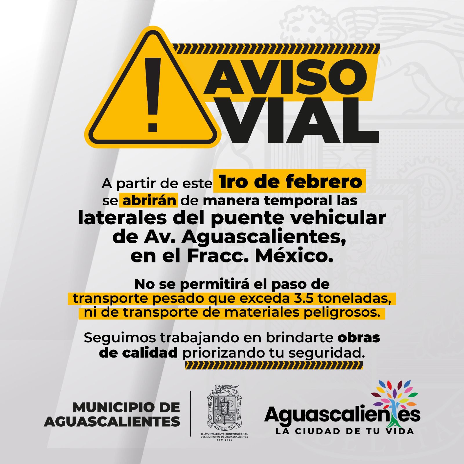 La Presidencia Municipal de Aguascalientes dio a conocer que a partir de este miércoles 1 de febrero se abrirán a la circulación vehicular las laterales de la avenida Aguascalientes Sur a la altura del fraccionamiento México, para dar mayor fluidez vial a la zona mientras se realizan los trabajos de rehabilitación del puente que se ubica en este punto.