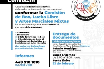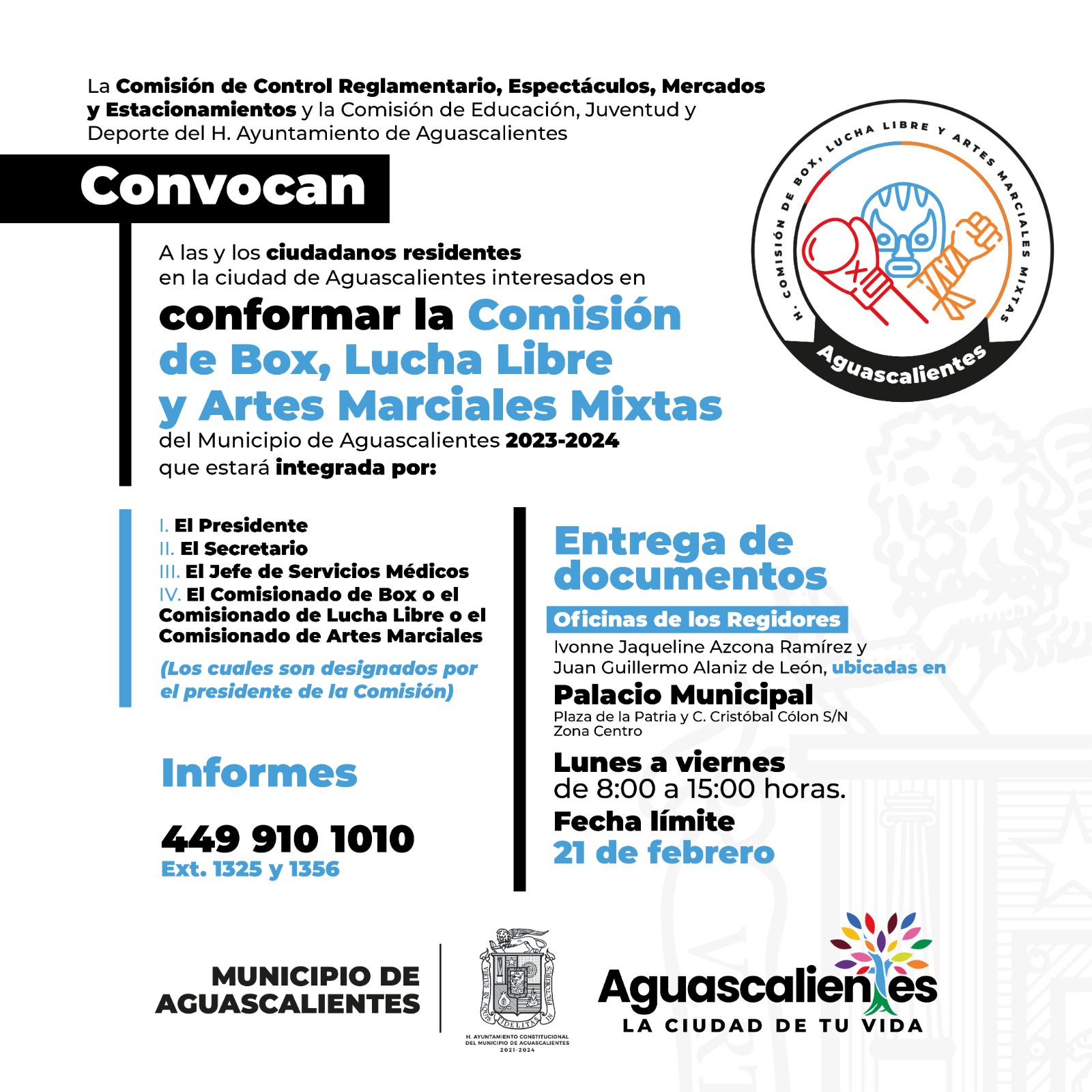 A través de las Comisiones de Control Reglamentario, Espectáculos, Mercados y Estacionamientos y de Educación, Juventud y Deporte del H. Ayuntamiento de Aguascalientes se convoca a conformar la Comisión de Box, Lucha Libre y Artes Marciales Mixtas del Municipio de Aguascalientes 2023-2024.