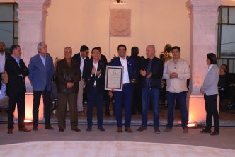 Germán Mercado Lamm, presidente de la Asociación Nacional de Criadores de Toros de Lidia, hizo entrega de un reconocimiento al presidente municipal, Leo Montañez, por todo el apoyo a los jóvenes futuras promesas de la fiesta brava que acuden a la Academia Taurina Municipal.