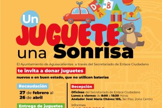 La Presidencia Municipal de Aguascalientes, a través del Secretariado de Enlace Ciudadano convoca a participar en la campaña “Un juguete, una sonrisa”, gracias a la cual se conjuntará la participación ciudadana para donar juguetes y beneficiar a niñas y niños en situación vulnerable.