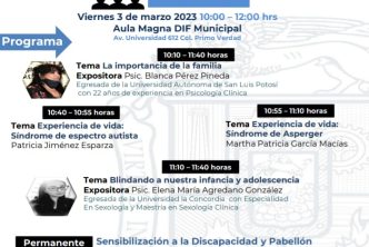 Humberto Montero expuso que además este viernes 3 de marzo se llevará a cabo un foro en el Aula Magna de esta institución y se contará con la participación de dos expositoras que impartirán importantes temas para el desarrollo como: La importancia de la familia, Blindando nuestra infancia y adolescencia, así como Síndrome de Asperger y Síndrome de Espectro Autista; comentó que además se instalará el pabellón de discapacidad y sensibilización para concientizar y sensibilizar a las personas sobre la inclusión y cultura de la discapacidad.