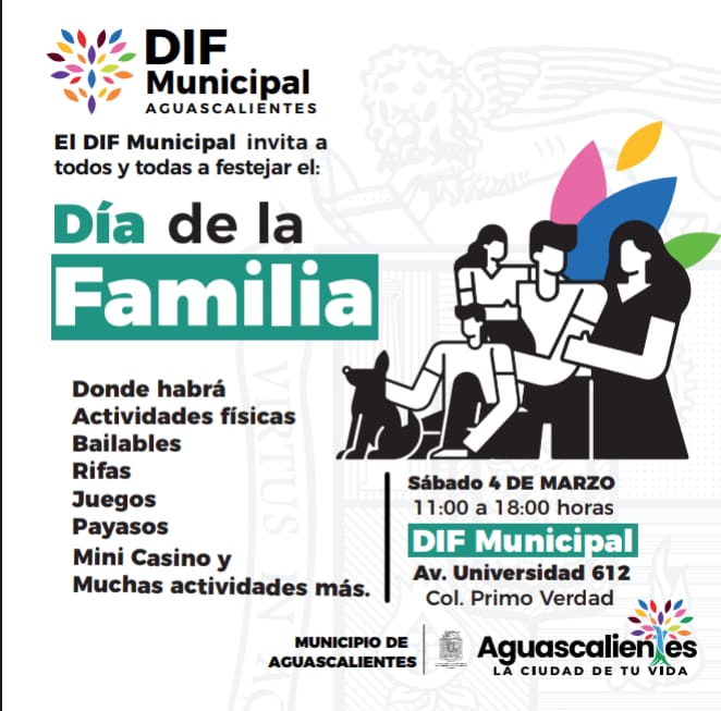El DIF Municipal de Aguascalientes invita a festejar el Día de la Familia 2023 con una serie de divertidas actividades para fomentar la convivencia y la unión social. El director general de la Institución, Humberto Montero de Alba mencionó que la celebración se llevará a cabo este sábado 4 de marzo en las instalaciones del DIF de Av. Universidad, desde las 11:00 y hasta las 18:00 horas.