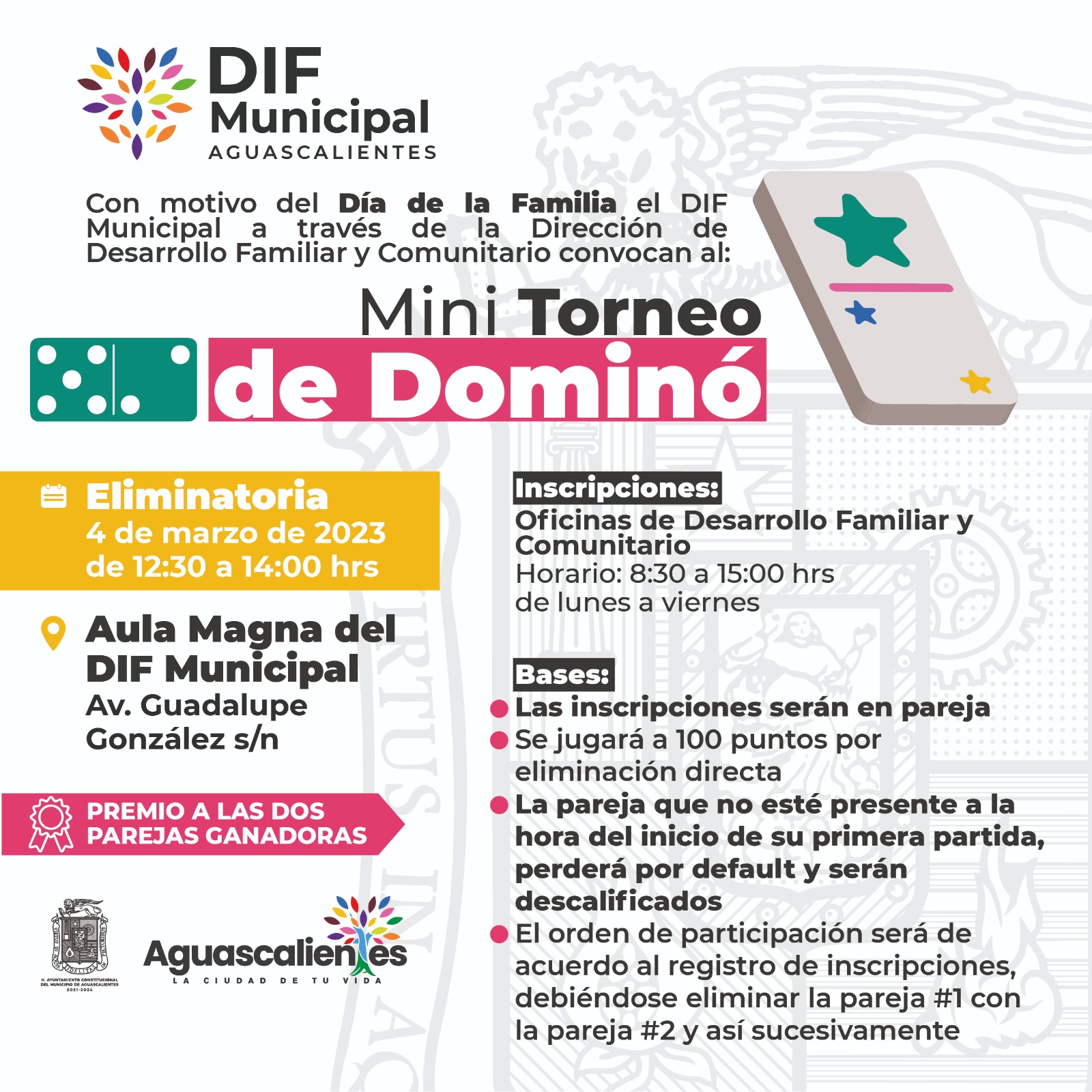 Además se realizará un torneo de dominó en las instalaciones del Aula Magna del DIF Municipal, en donde se vivirán emocionantes momentos y se premiará a las dos parejas ganadoras.