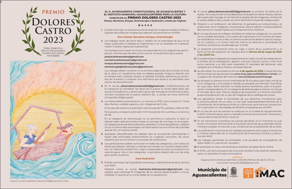 Como parte de las actividades por el Mes de la Mujer, el Ayuntamiento de Aguascalientes a través del Instituto Municipal Aguascalentense para la Cultura (IMAC), presentó la Convocatoria al Premio Dolores Castro 2023, en las categorías de Poesía, Narrativa, Ensayo, Dramaturgia e Ilustración creadas por mujeres.