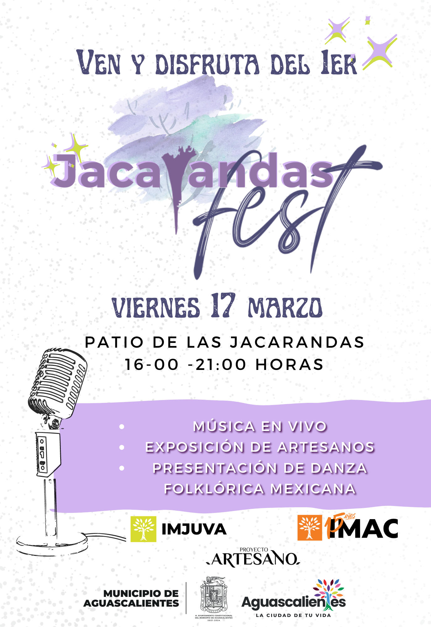 El Instituto Municipal de la Juventud de Aguascalientes (Imjuva), en colaboración con el Instituto Municipal Aguascalentense para la Cultura (Imac), invitan a  disfrutar del primer “Jacarandas Fest”, que se llevará a cabo el viernes 17 de marzo de 2023 en el Patio de las Jacarandas, a partir de las 16:00 horas.