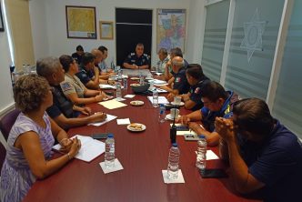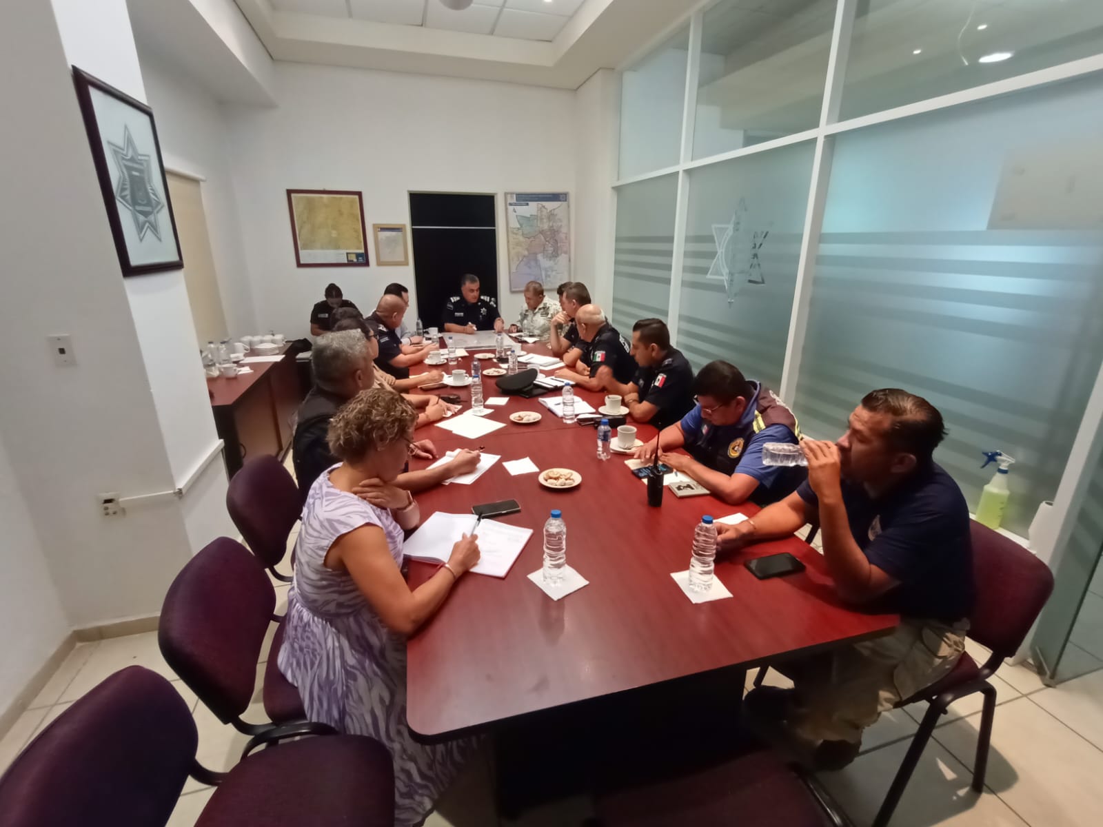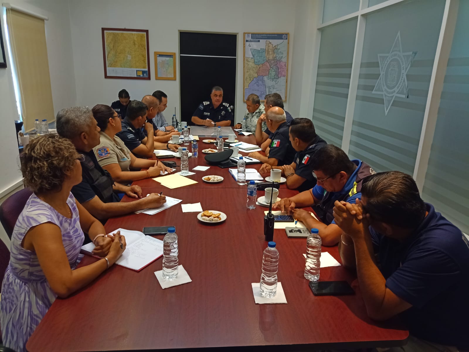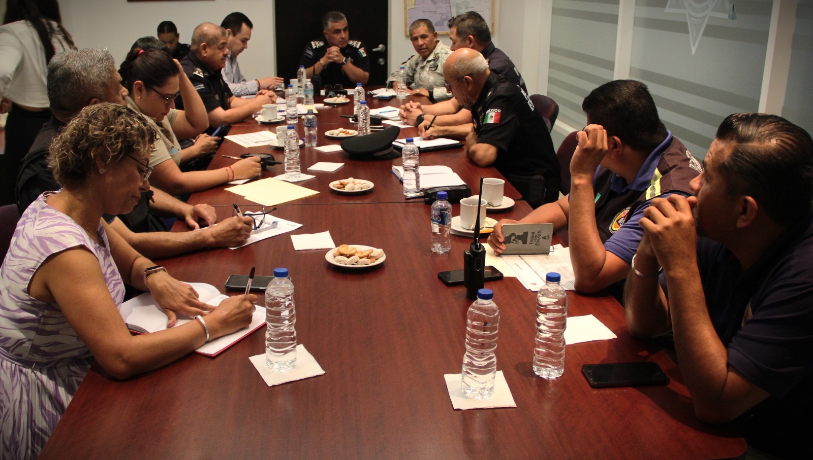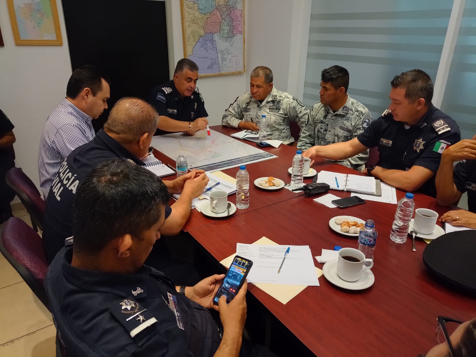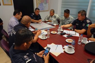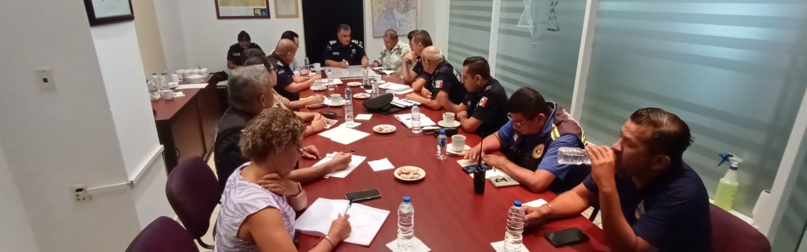 En esta reunión de trabajo participaron el director general de la Policía Estatal, Salvador Ortiz; el representante de la Guardia Nacional, José Manuel Aguilar; la representante de la Coordinación Estatal de Protección Civil, Mayra Berenice Gómez Torres y Gabino Vázquez, coordinador de Protección Civil Municipal; además de Oscar Carranza, director de Estado Mayor; Arturo Martínez Morales, director de Movilidad y Gonzalo Pérez Zúñiga, de la Dirección de la Policía Preventiva.