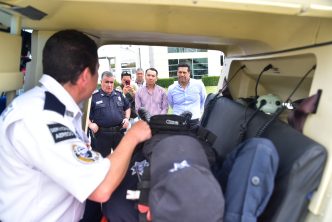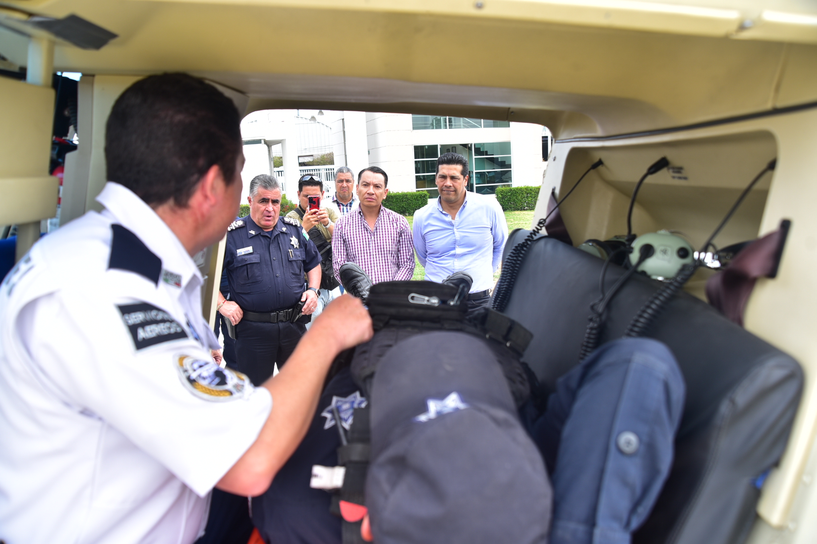Se le realizó una demostración al mandatario municipal sobre el funcionamiento del helicóptero «Halcón – 1», sus necesidades y manejo, así como las actividades que realizan los elementos policiales una vez que arriban a la unidad para proporcionar la atención aérea oportuna.