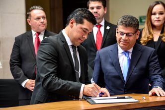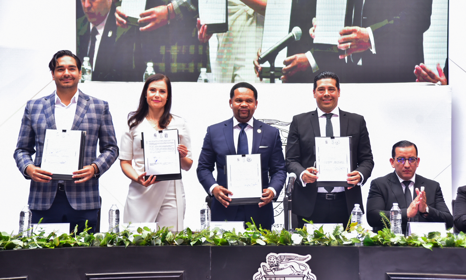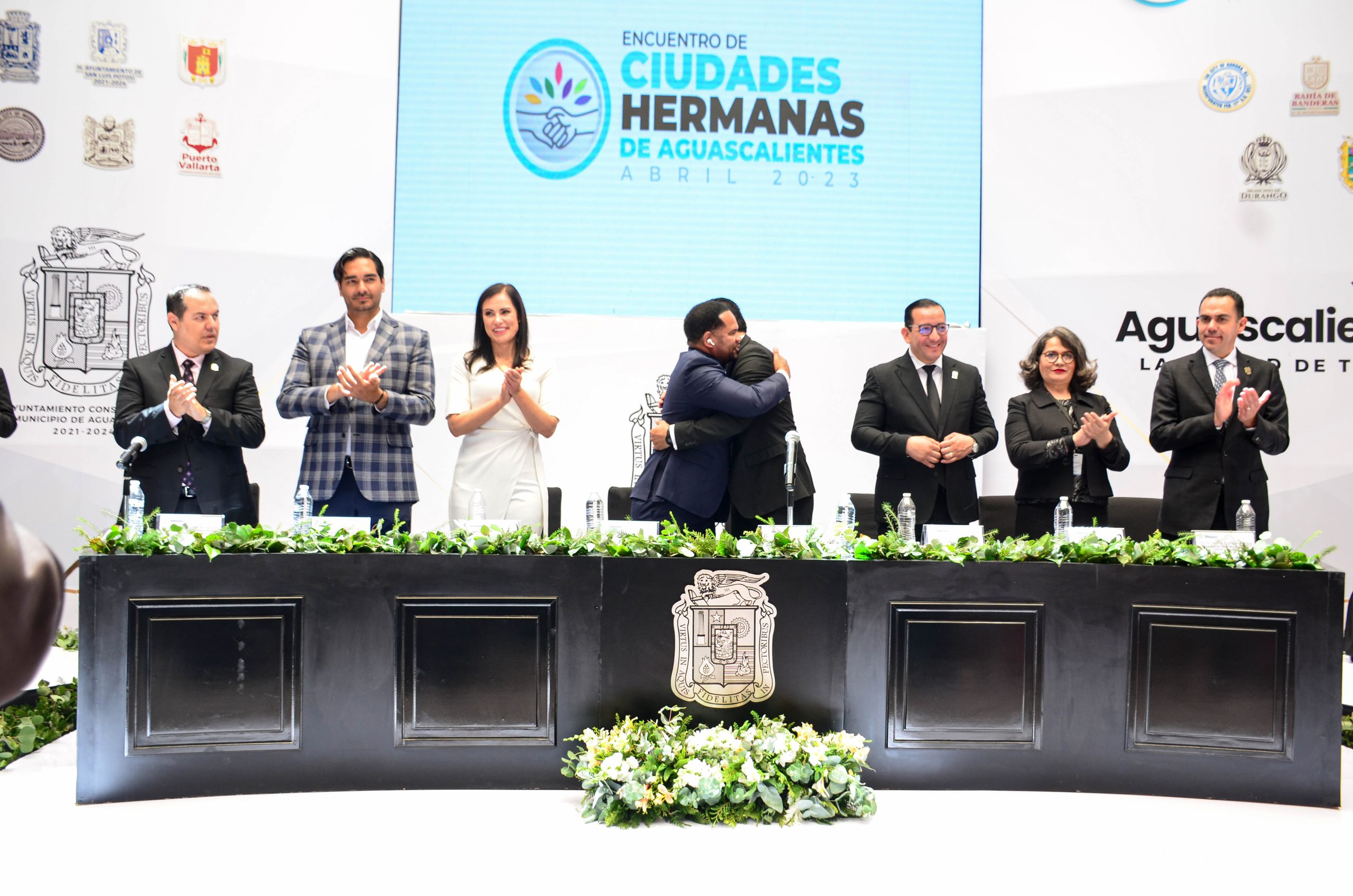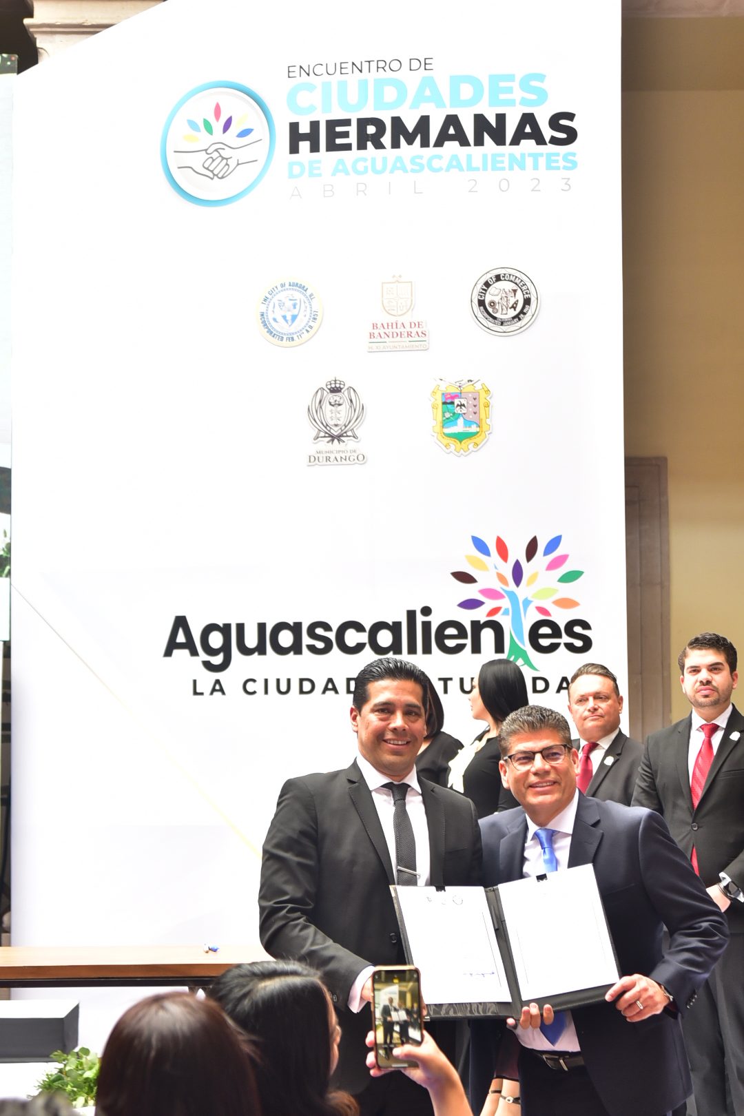Ante Manuel Alejandro González Martínez, secretario de Desarrollo Económico, Ciencia y Tecnología, en representación de la gobernadora Tere Jiménez; Juana Patricia Escalante Jiménez, jueza tercero mercantil del Estado en representación del Poder Judicial del Estado, así como el diputado Salvador Maximiliano Ramírez Hernández, presidente de la Mesa Directiva del H. Congreso del Estado; Leo Montañez agradeció el trabajo en equipo con el Ayuntamiento y reconoció la voluntad y trabajo unido con estas ciudades para generar nuevos beneficios, especialmente para que Aguascalientes sea un ejemplo del turismo médico seguro; además para el intercambio cultural como la feria y la ruta del vino, dar un empuje conjunto a los sectores productivos y seguir siendo referente como acelerador de procesos a través de estos hermanamientos que marcarán el rumbo de Aguascalientes.