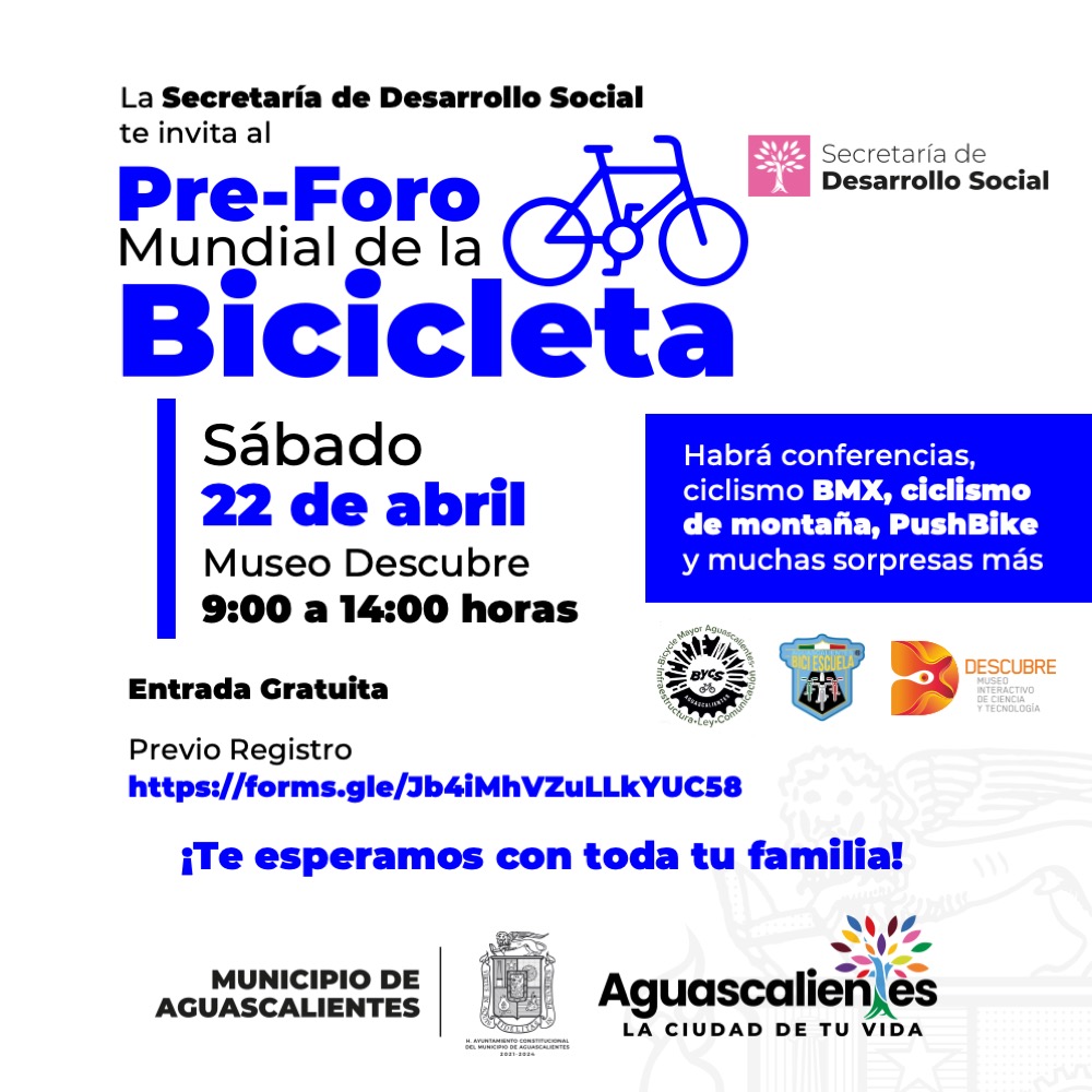 El Municipio de Aguascalientes a través de la Secretaría de Desarrollo Social (Sedesom) invita al Preforo Mundial de la Bicicleta, que se llevará a cabo de manera gratuita el sábado 22 de abril de 2023, de 9:00 a 14:00 horas en las instalaciones del Museo Descubre en donde participarán expertos en seguridad vial, movilidad peatonal, ciclista y de vehículos automotores.