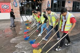 A partir de las 7 de la mañana inicia el lavado profundo de estas mismas áreas en donde se suman los voluntarios de servicio comunitario reforzando al personal de Aseo Público en el barrido manual y retiro de agua.