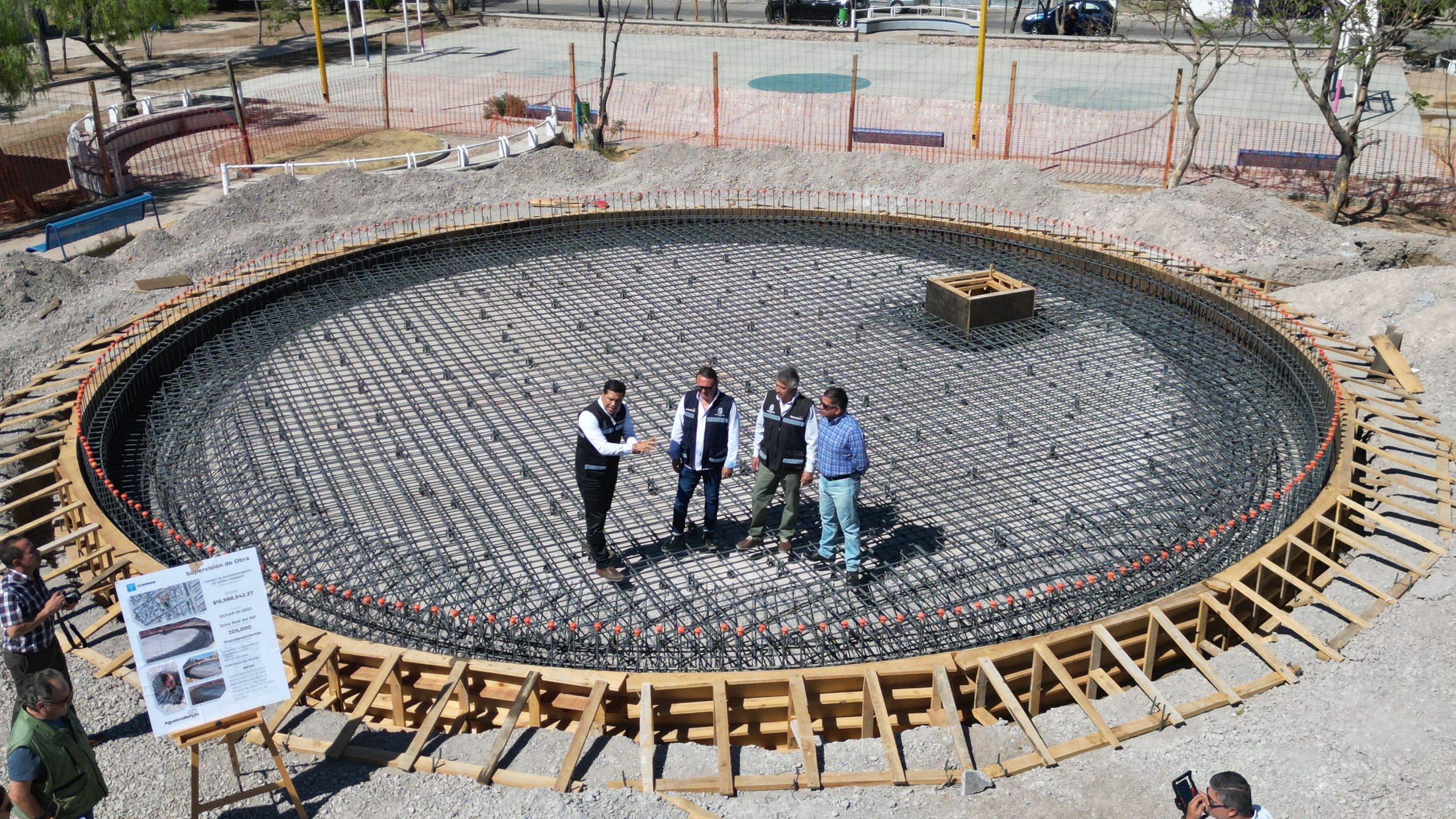 Rafael Berumen Esparza, encargado de despacho de la Comisión Ciudadana de Agua Potable y Alcantarillado del Municipio de Aguascalientes (CCAPAMA), indicó que este tanque tiene una capacidad de 1 millón 500 mil litros de agua y se construye con una inversión cercana a los 17 millones de pesos, en beneficio de los habitantes de los fraccionamientos como: Haciendas de Aguascalientes, Ojocaliente I, II y III, Villerías y Real de Haciendas.