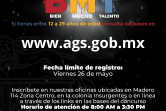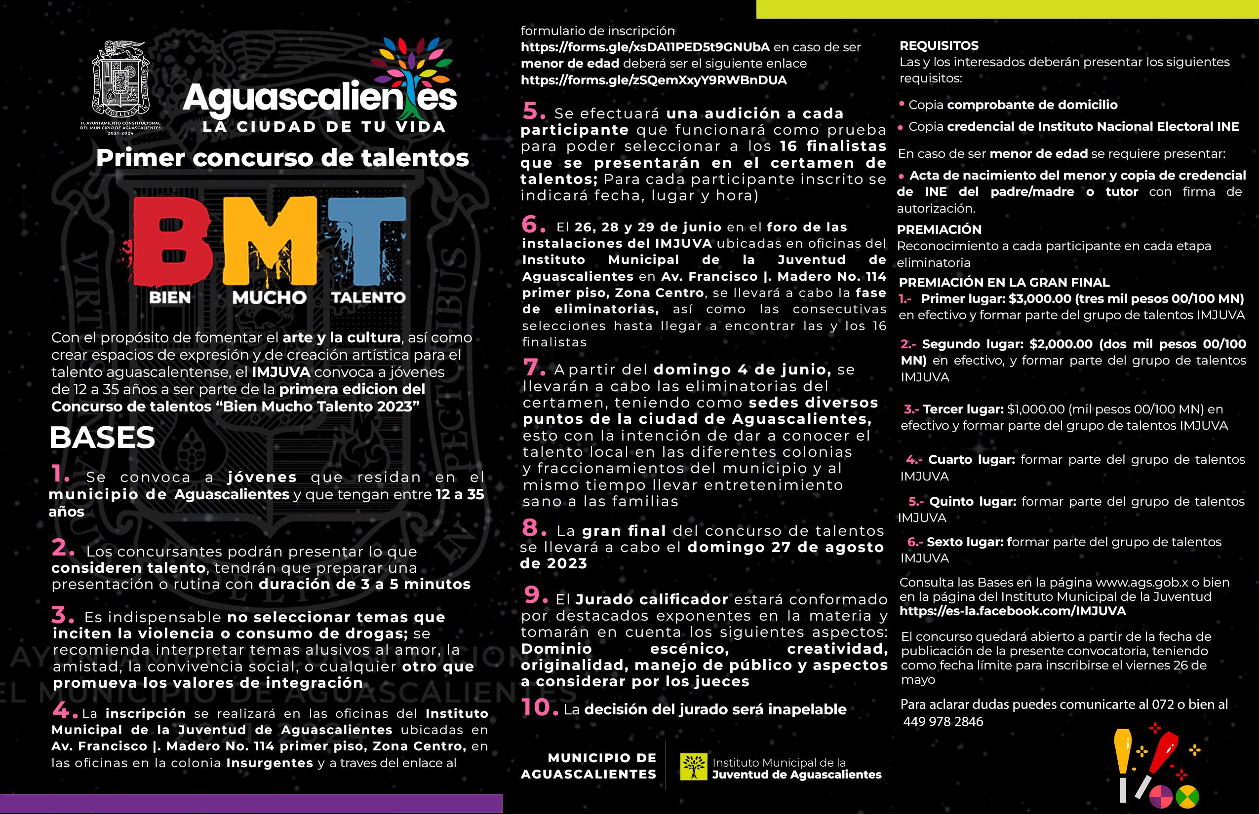 La directora del Imjuva, Karla Ortega González, mencionó que las bases se pueden encontrar en la página del Municipio de Aguascalientes https://www.ags.gob.mx/ o en las redes del Instituto Municipal de la Juventud de Aguascalientes. La fecha límite de registro es hasta el 25 de mayo, y las audiciones serán los días 25, 26 y 27 de mayo.