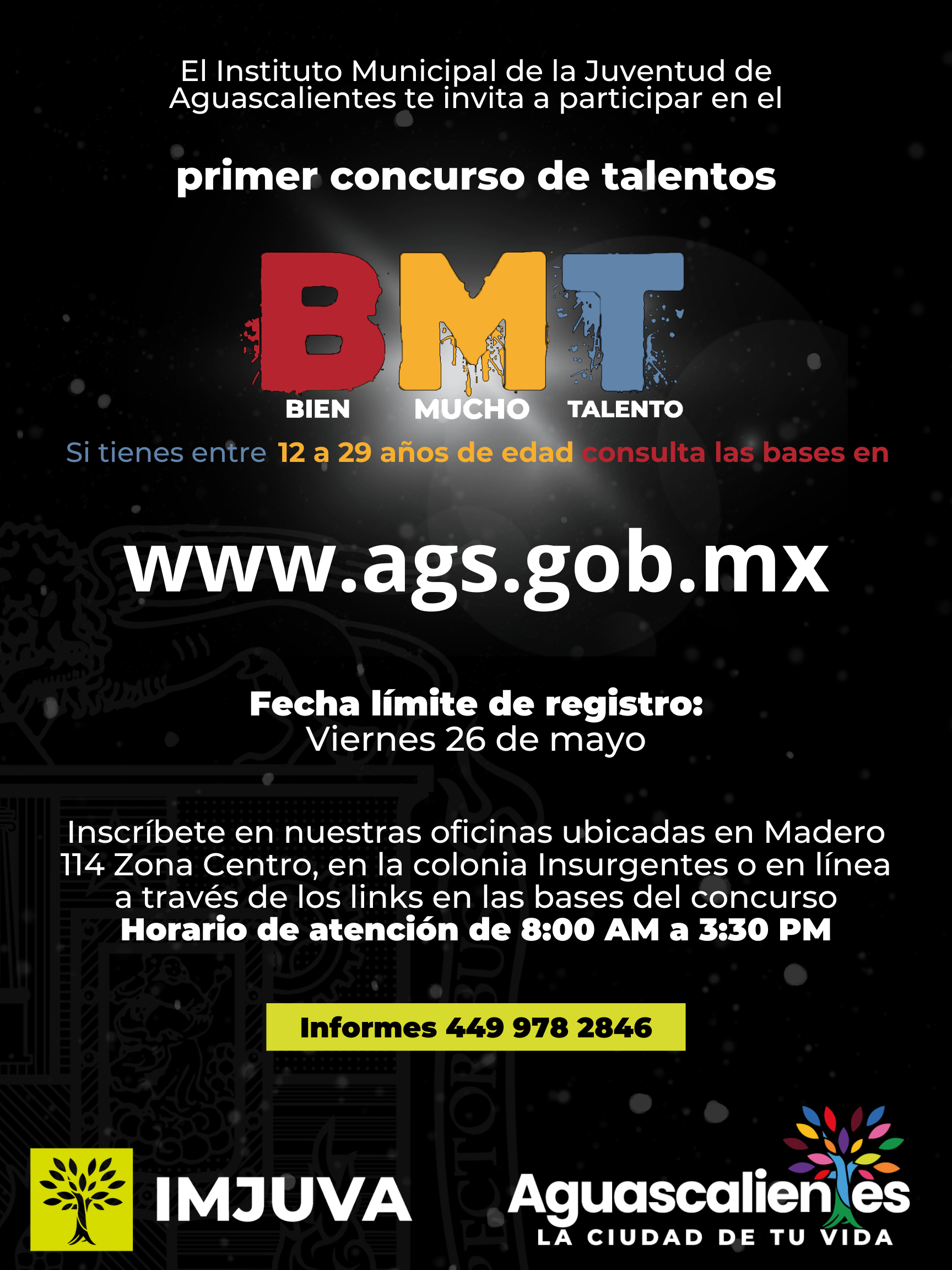 El Instituto Municipal de la Juventud de Aguascalientes (Imjuva) invita a personas entre 12 y 35 años de edad, a participar en el primer concurso “Bien Mucho Talento”, a través del que podrán dar muestra de sus habilidades y ganar importantes premios.