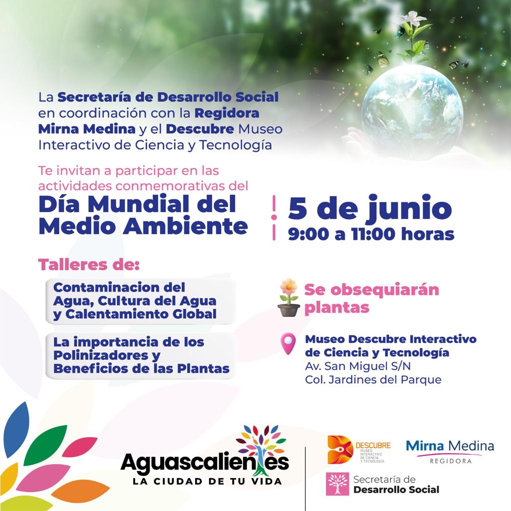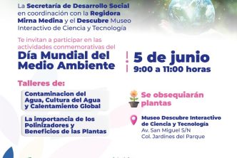 Con el fin de seguir fomentando la participación de niños, jóvenes y adultos en el tema ecológico, la Secretaría de Desarrollo Social, en coordinación con la regidora Mirna Medina Ruvalcaba, presidenta de la Comisión Permanente de Ecología, Parques, Jardines y Panteones y Descubre Museo Interactivo de Ciencia y Tecnología, invitan a participar en los talleres conmemorativos por el Día Mundial del Medio Ambiente.