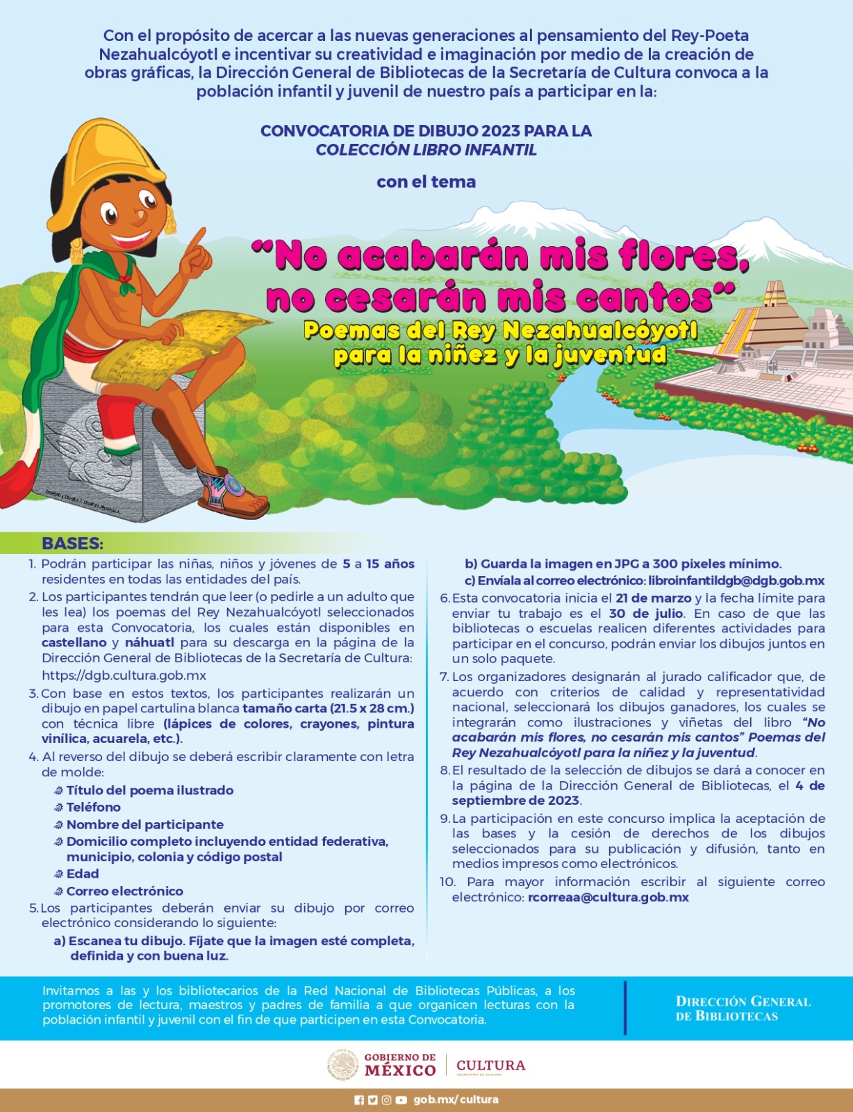 La Secretaría de Desarrollo Social Municipal (Sedesom) , invita a la población infantil y juvenil a participar en la convocatoria nacional de dibujo 2023 de la Dirección General de Bibliotecas, para integrar la Colección de Libro Infantil que este año se impulsa con el tema: “No acabarán mis flores, no cesarán mis cantos”, Poemas del Rey Nezahualcóyotl para la niñez y la juventud.