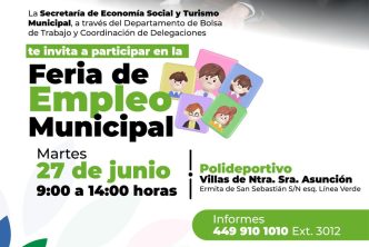 El Municipio de Aguascalientes a través de la Secretaría de Economía Social y Turismo Municipal (Setum), llevará a cabo el próximo martes 27 de junio, una Feria de Empleo en la que se ofertarán más de 600 vacantes, con el objetivo de brindar más y mejores oportunidades a la ciudadanía.