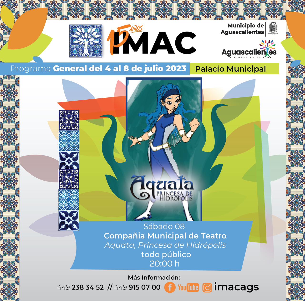 - Demostración de la Compañía Municipal de Teatro con la obra “Aguata, Princesa de Hidrópolis”, a las 20:00 horas, historia que tiene como objetivo bridar un mensaje sobre la importancia del cuidado del agua.