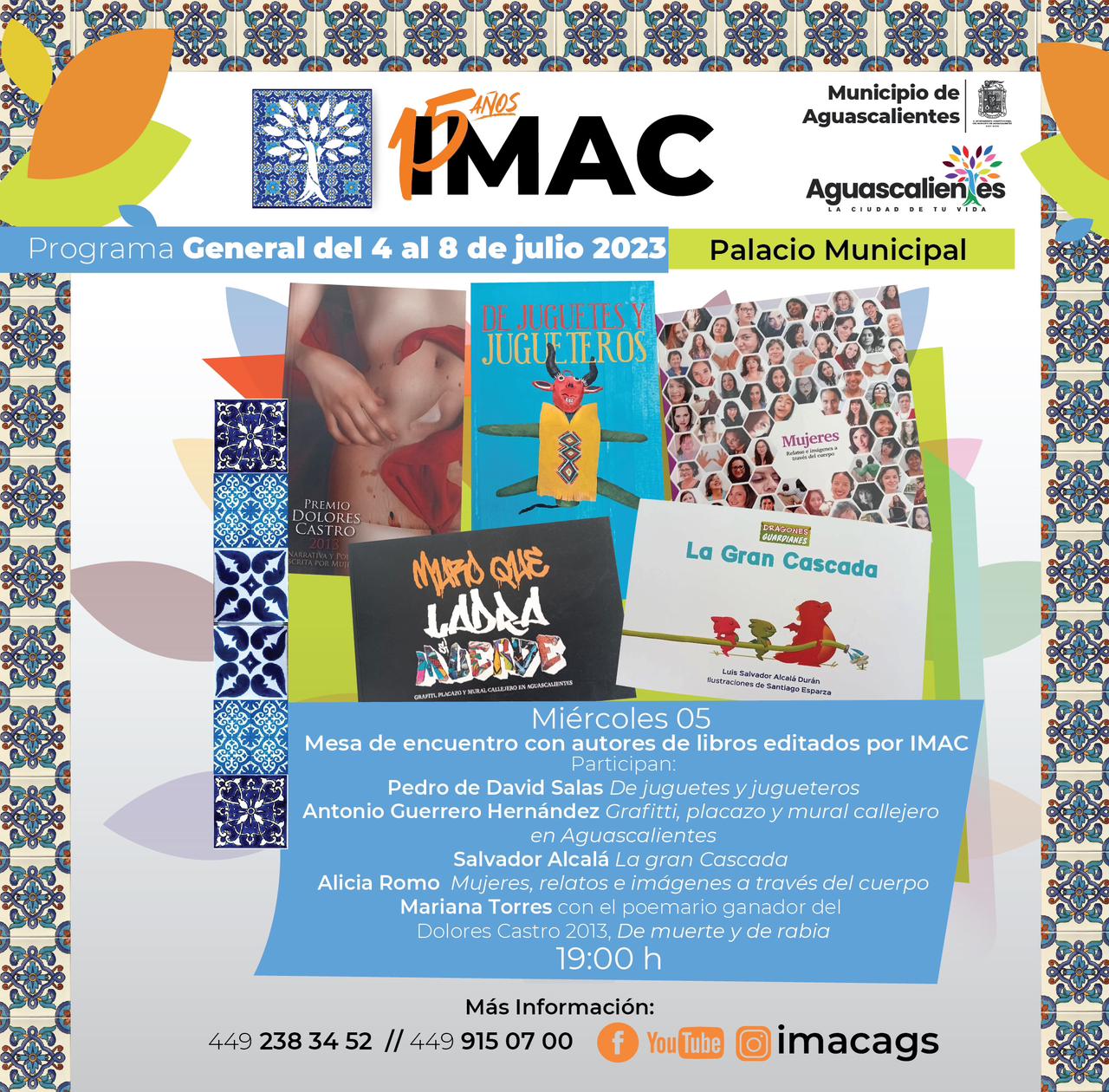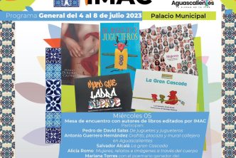- Mesa de encuentro con autores de libros publicados por el IMAC, en punto de las 19:00 horas, en donde participarán Pedro de David Salas de “Juguetes y Jugueteros”; Antonio Guerrero Hernández, por “Grafitti, placazo y mural callejero en Aguascalientes”; Salvador Alcalá, por “La gran Cascada”; Alicia Romo, por “Mujeres, relatos e imágenes a través del cuerpo”; así como Mariana Torres, con el poemario ganador del premio dolores Castro 2013, “De Muerte y Rabia”