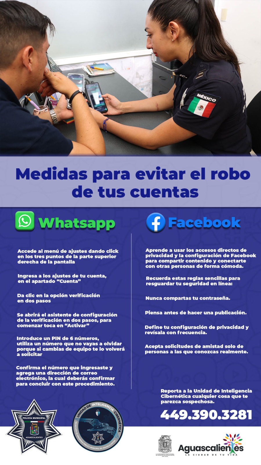 La Secretaría de Seguridad Pública Municipal de Aguascalientes (SSPM) a través de la Unidad de Inteligencia Cibernética (UIC), hace un llamado a la ciudadanía a proteger sus cuentas de Whatsapp y de Facebook para evitar ser víctimas de robo de identidad.