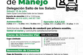 La Coordinación General de Delegaciones Urbanas y Rurales invita a la ciudadanía a tramitar la licencia de manejo para automovilista y operador tipo A, B, C, D y E este próximo sábado 15 de julio en la Delegación Salto de los Salado, de las 9:00 a las 13:00 horas.