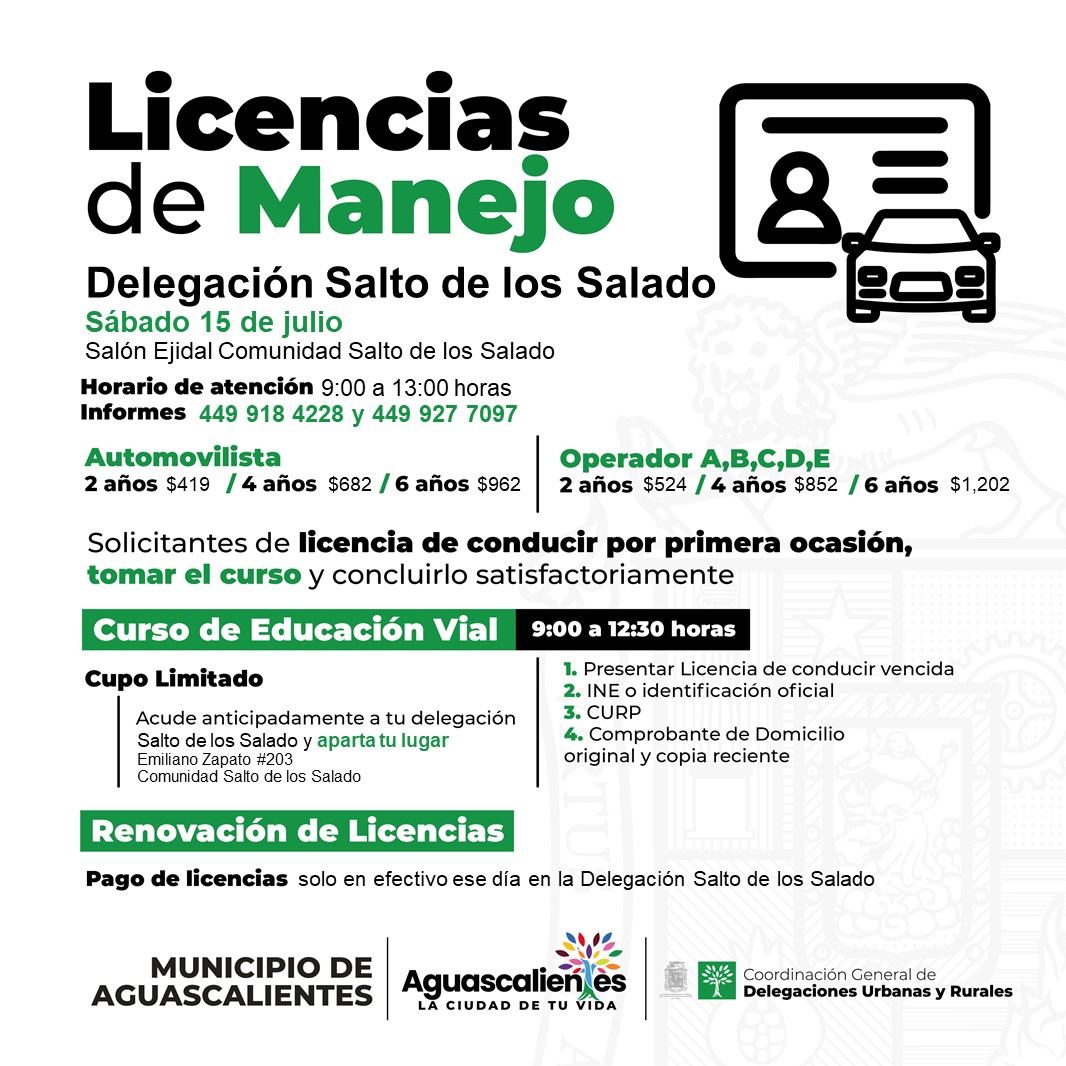 La Coordinación General de Delegaciones Urbanas y Rurales invita a la ciudadanía a tramitar la licencia de manejo para automovilista y operador tipo A, B, C, D y E este próximo sábado 15 de julio en la Delegación Salto de los Salado, de las 9:00 a las 13:00 horas.