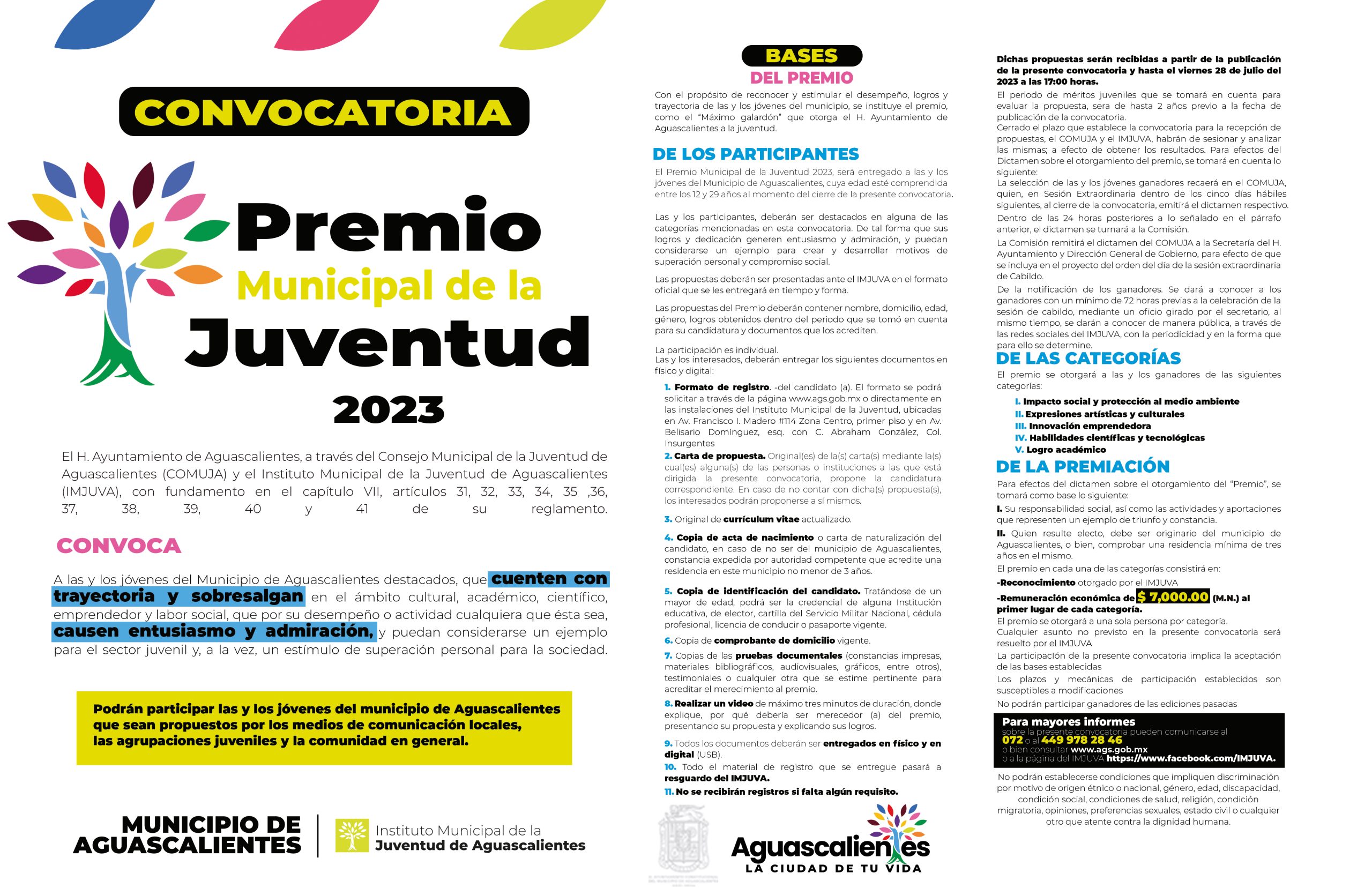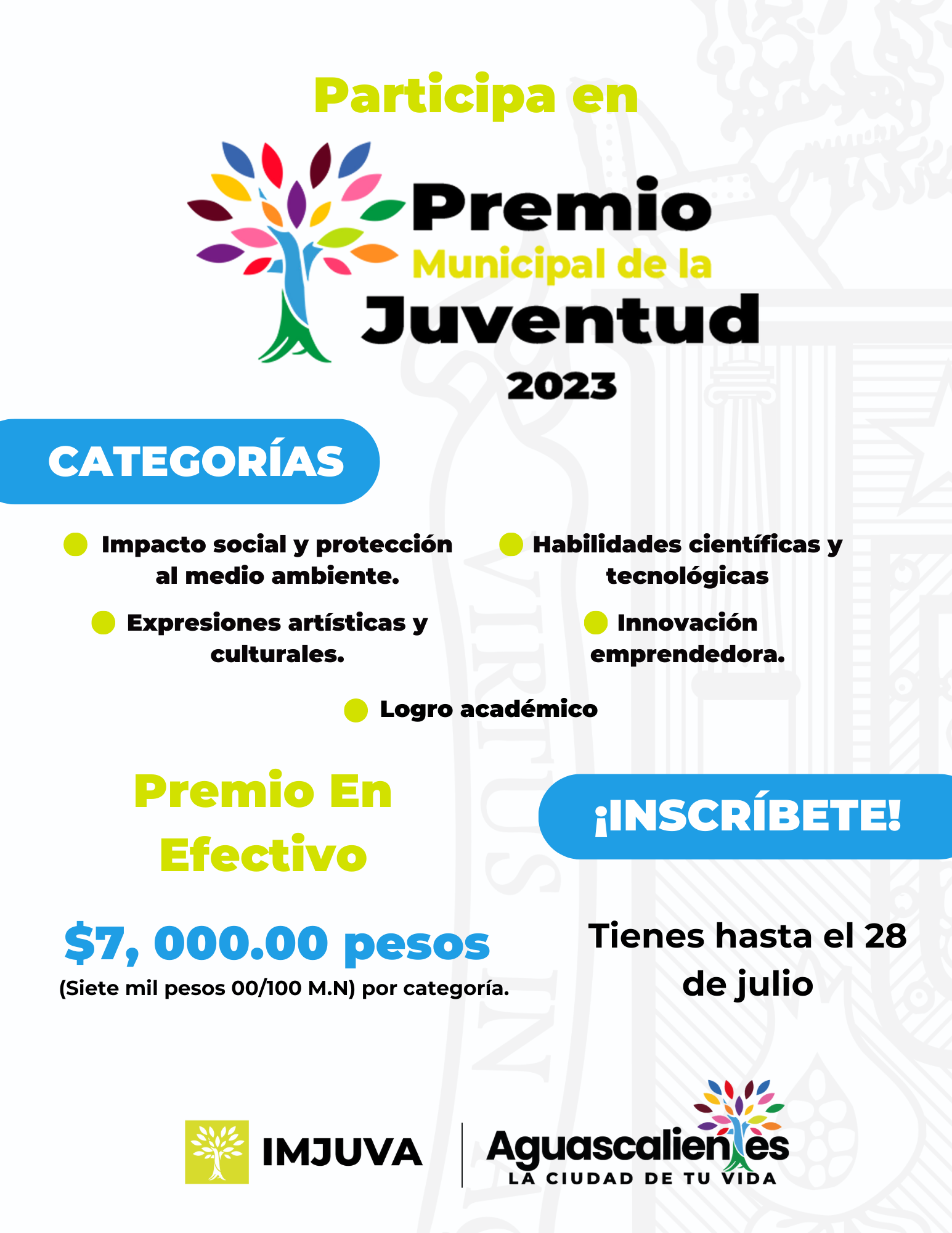 El Ayuntamiento de la Capital a través del Instituto Municipal de la Juventud de Aguascalientes (Imjuva) invita a participar en la Convocatoria al Premio Municipal de la Juventud 2023.
