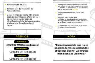 Se entregarán premios en efectivo a los tres primeros lugares. Las bases de la convocatoria se pueden consultar en redes sociales del Municipio de Aguascalientes.