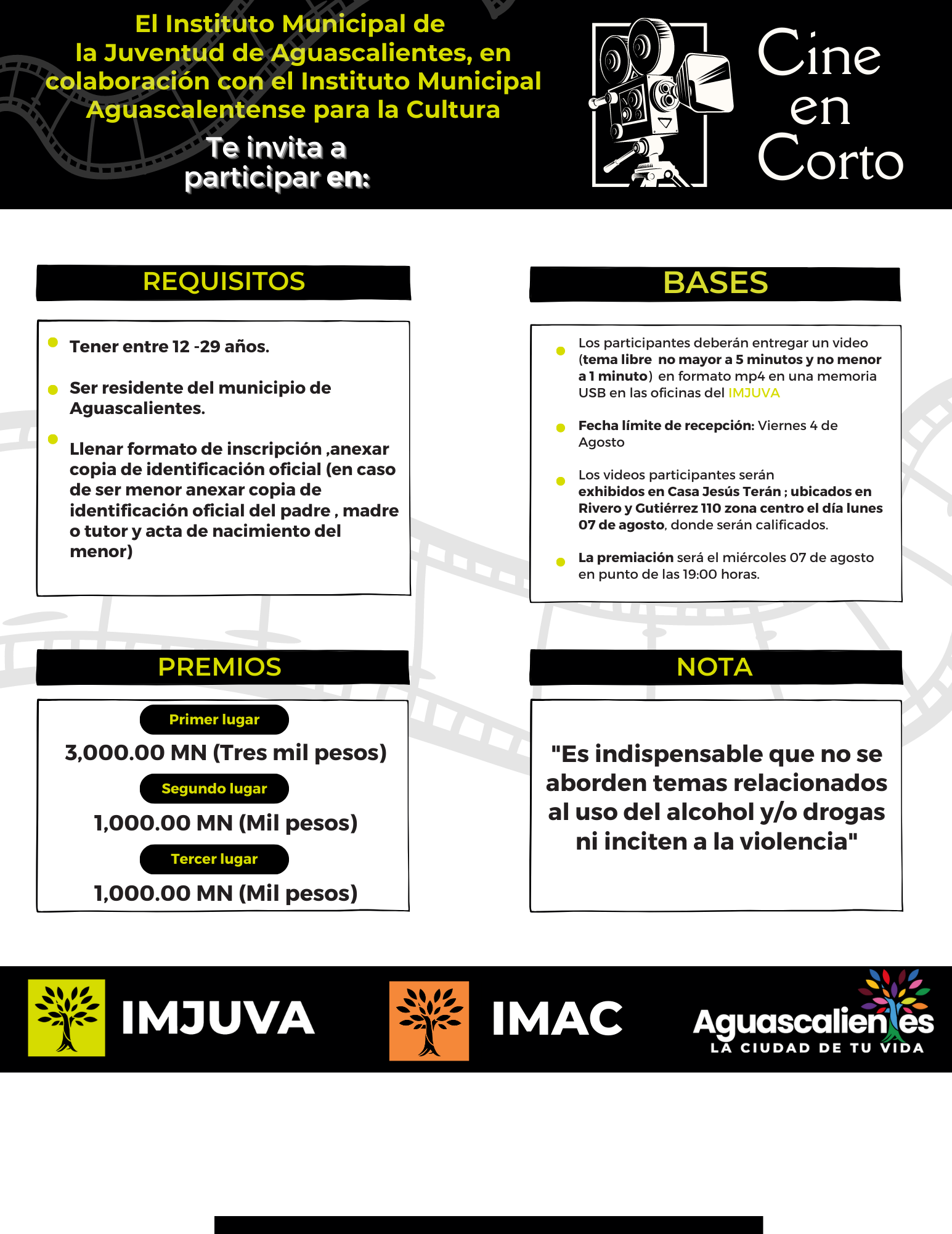 El Instituto Municipal de la Juventud de Aguascalientes (Imjuva) y el Instituto Municipal Aguascalentense para la Cultura (Imac), invitan a jóvenes de entre 12 y 29 años de edad, a participar en el primer concurso de clips de video “Cine en corto”.