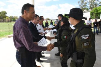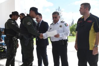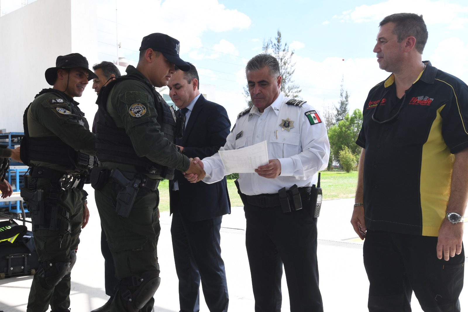 En el acto de entrega se contó con la presencia de Óscar Eduardo Carranza Ávila, director de Estado Mayor de la SSPM; Bernardo Martín García, coordinador de Operaciones y Servicios Aéreos y Luis Gerardo González Santos, director y capacitador de ENFORCER.