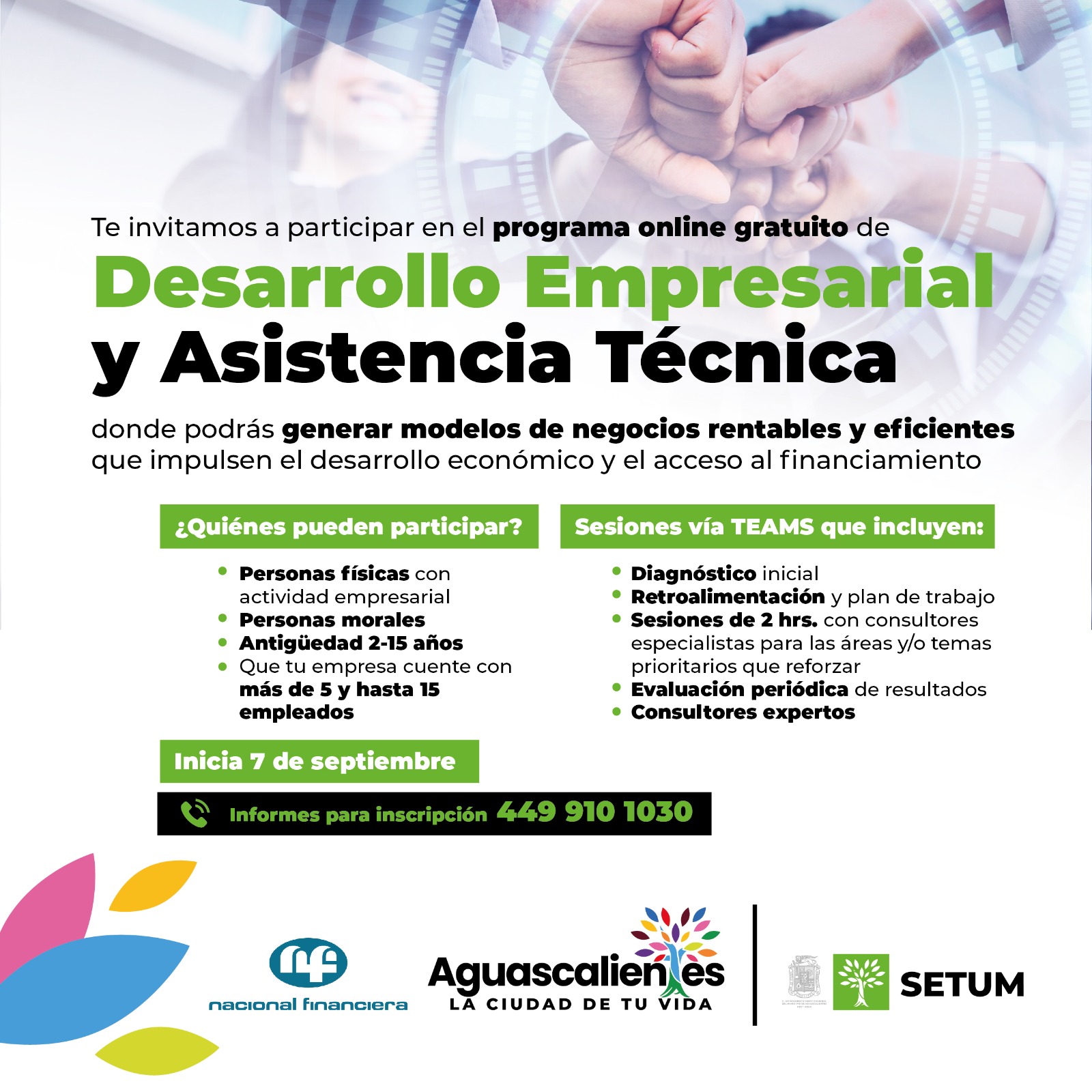 En un esfuerzo por fomentar el desarrollo económico y facilitar el acceso al financiamiento, y gracias al convenio de colaboración que tiene el Municipio de Aguascalientes y Nacional Financiera, la Secretaría de Economía Social y Turismo Municipal (SETUM), invita a las MiPyMES de Aguascalientes a inscribirse en las consultorías gratuitas de Desarrollo Empresarial y Asistencia Técnica para impulsar el crecimiento y la rentabilidad de las empresas locales a través de estas consultorías personalizadas.