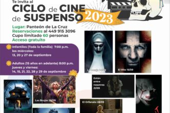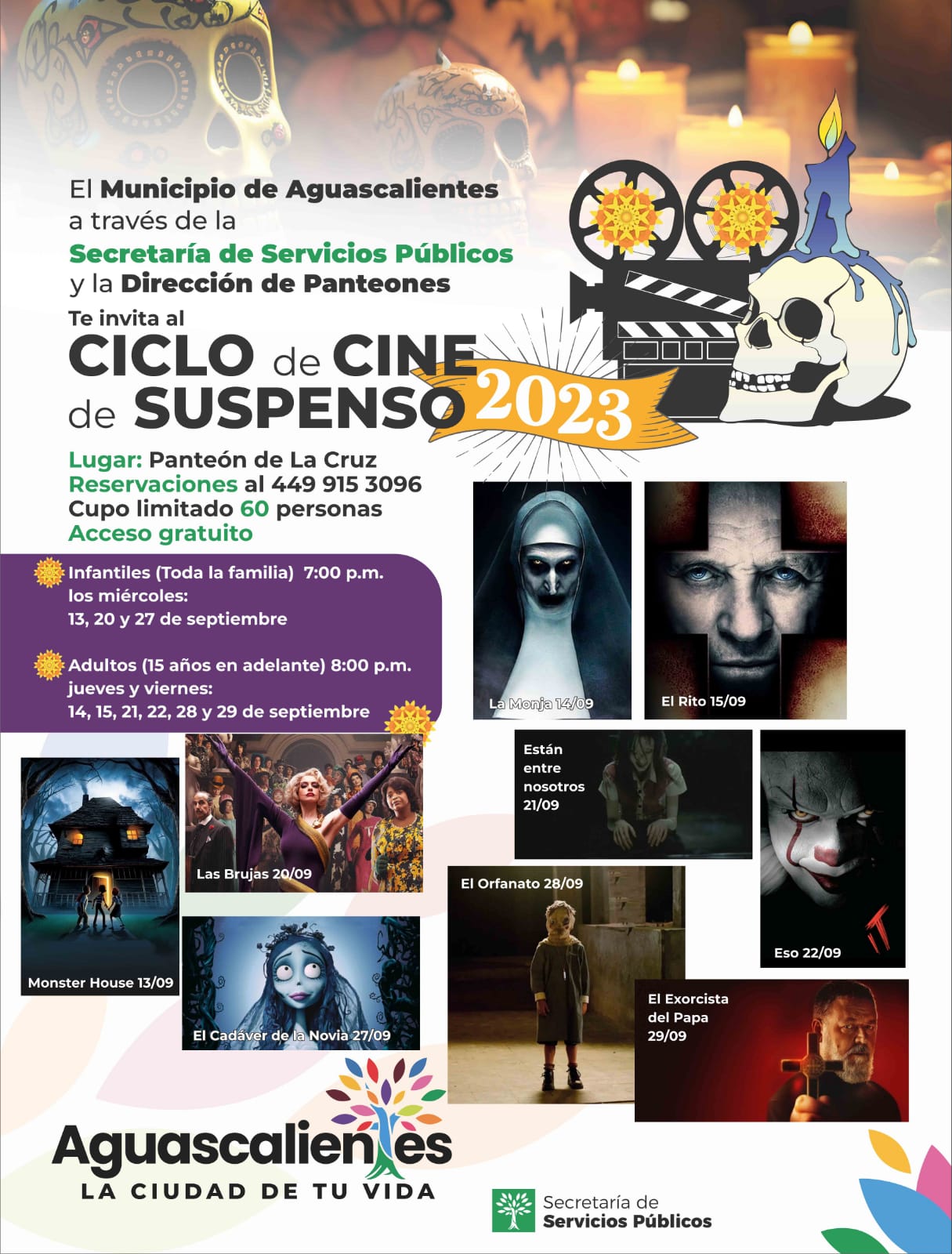La Secretaría de Servicios Públicos, a través de la Dirección de Panteones, presenta el cartel para el “Ciclo de cine de suspenso”, el cual se llevará a cabo en las instalaciones del Panteón de La Cruz, los miércoles, jueves y viernes de septiembre a partir del día 13.