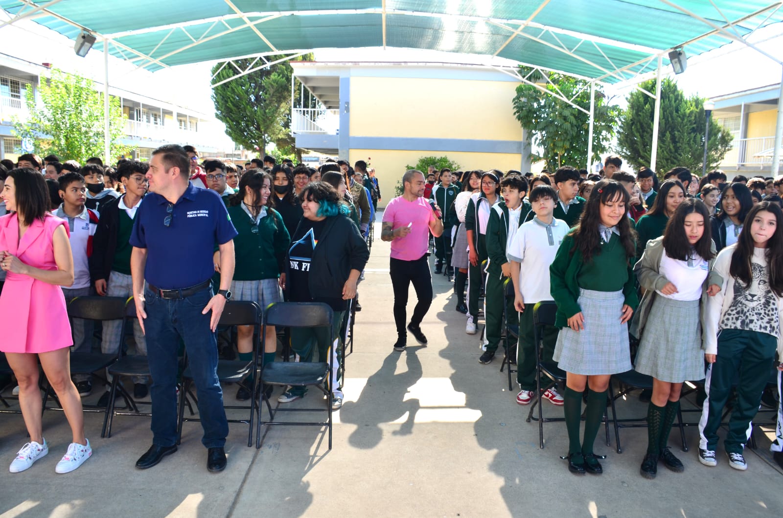 El presidente municipal, Leo Montañez, visitó la Escuela Secundaria General No. 32 “Jesús Aguilera Palomino”, para participar en la presentación del programa “Alejado de Riesgos”, impulsado por la regidora Alejandra Peña y que tiene por objetivo sensibilizar y concientizar a los jóvenes y adolescentes sobre los daños que ocasiona el consumo de sustancias ilícitas y malas decisiones.