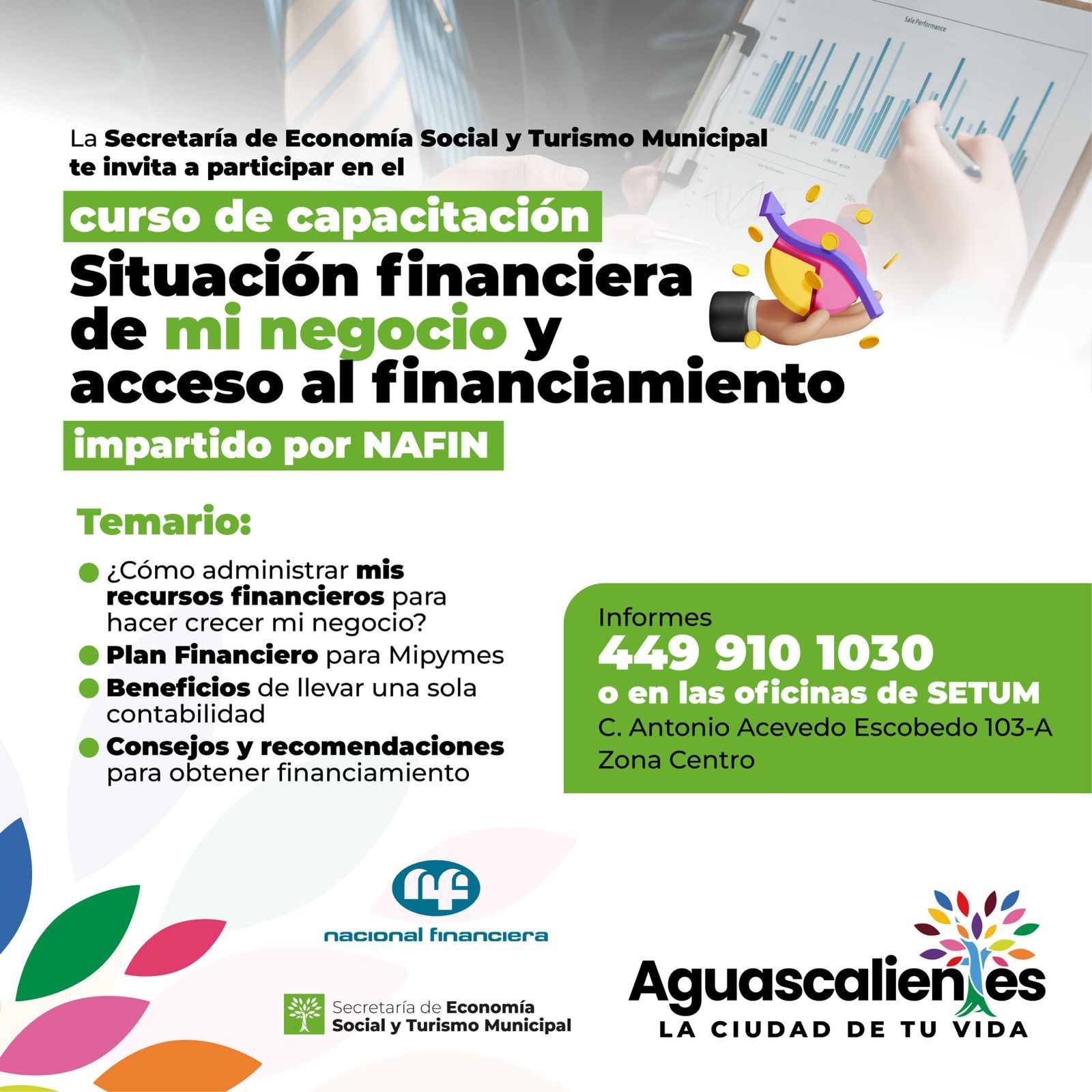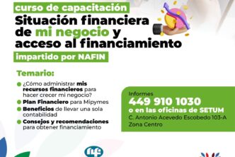 El Municipio de Aguascalientes a través de la Secretaría de Economía Social y Turismo Municipal (Setum), invita a los emprendedores a participar en el curso de capacitación especializado: «Situación Financiera de mi Negocio y Acceso al Financiamiento” impartido por Nacional Financiera (Nafin).