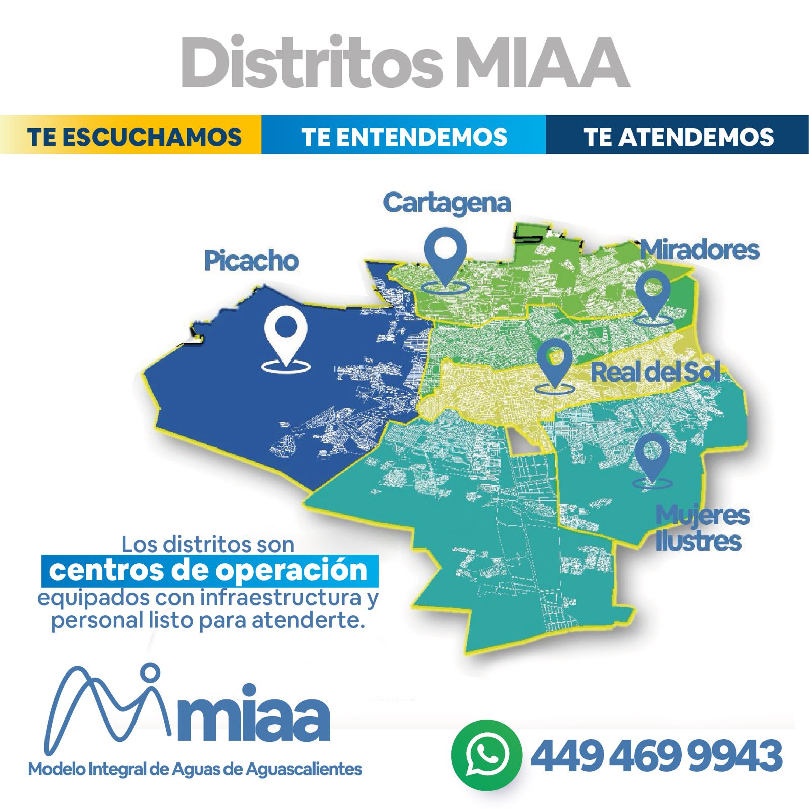 Para brindar una atención de mayor calidad, el Modelo Integral de Aguas de Aguascalientes (MIAA) implementará una estrategia para sectorizar el trabajo y mejorar el servicio a la ciudadanía, que será a través de 5 distritos: Cartagena, Miradores, Mujeres Ilustres, Real del Sol y Picacho.