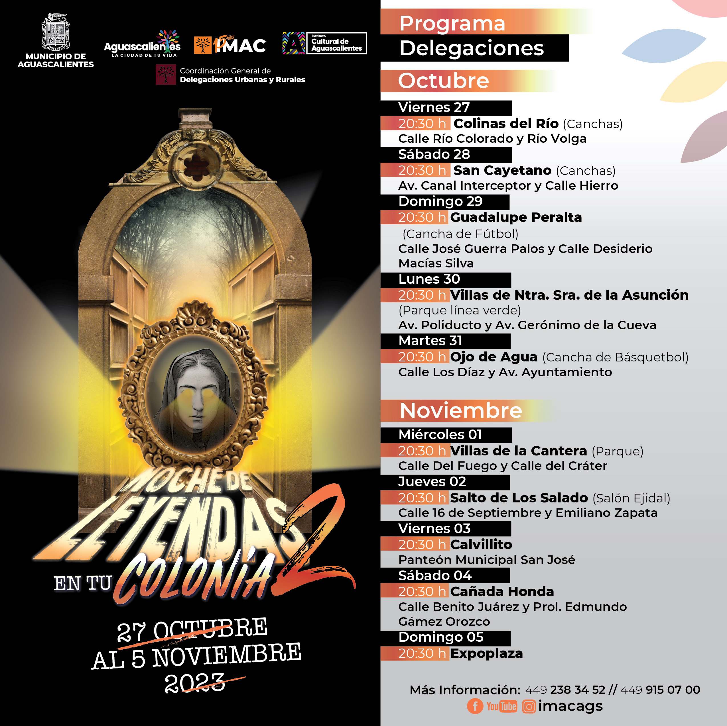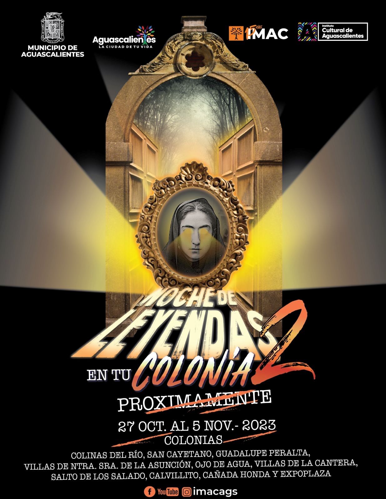 El Instituto Municipal Aguascalentense para la Cultura (Imac) y el Instituto de Cultura de Aguascalientes (ICA), invitan a la ciudadanía a disfrutar de la segunda edición del espectáculo “Noche de Leyendas en tu Colonia”, que se llevará a cabo del viernes 27 de octubre al domingo 5 de noviembre.