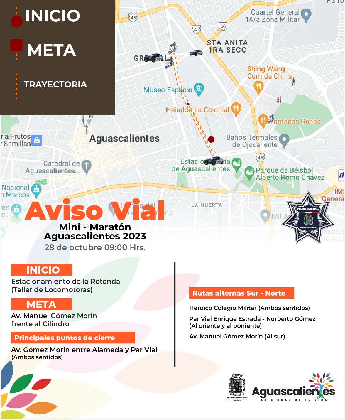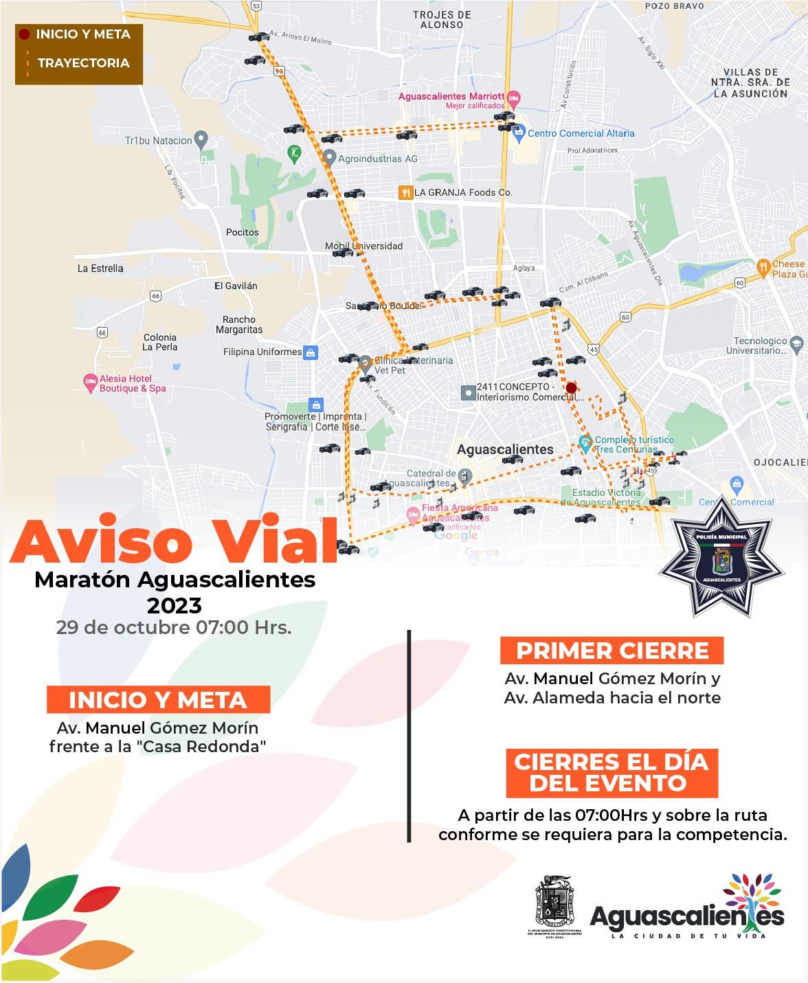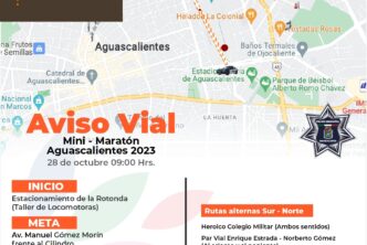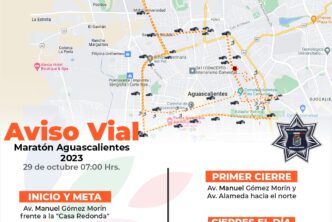 Dijo que el domingo 29 de octubre, el “Maratón Aguascalientes 2023” comenzará a las 07:00 horas con la salida y meta en la Av. Manuel Gómez Morín, frente a la Casa Redonda; tendrá una duración aproximada de 7 horas y para los preparativos, esta avenida, al igual que Alameda (hacia el norte), serán cerrarán desde las 00:00 horas.