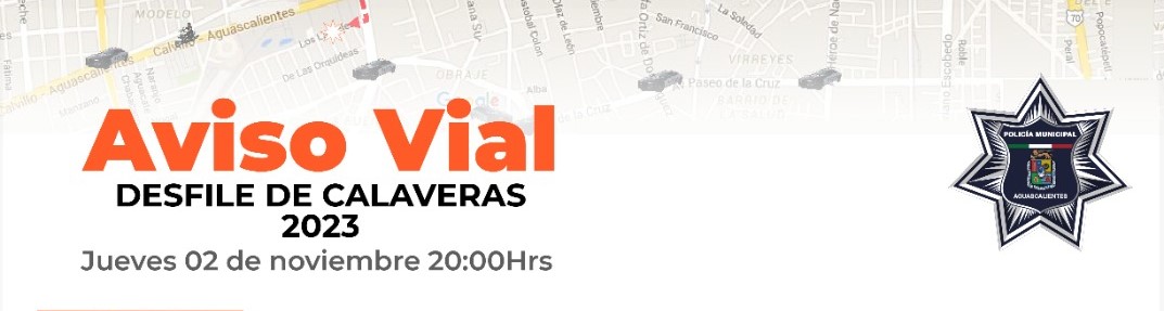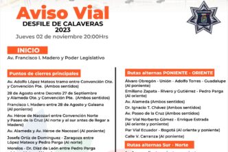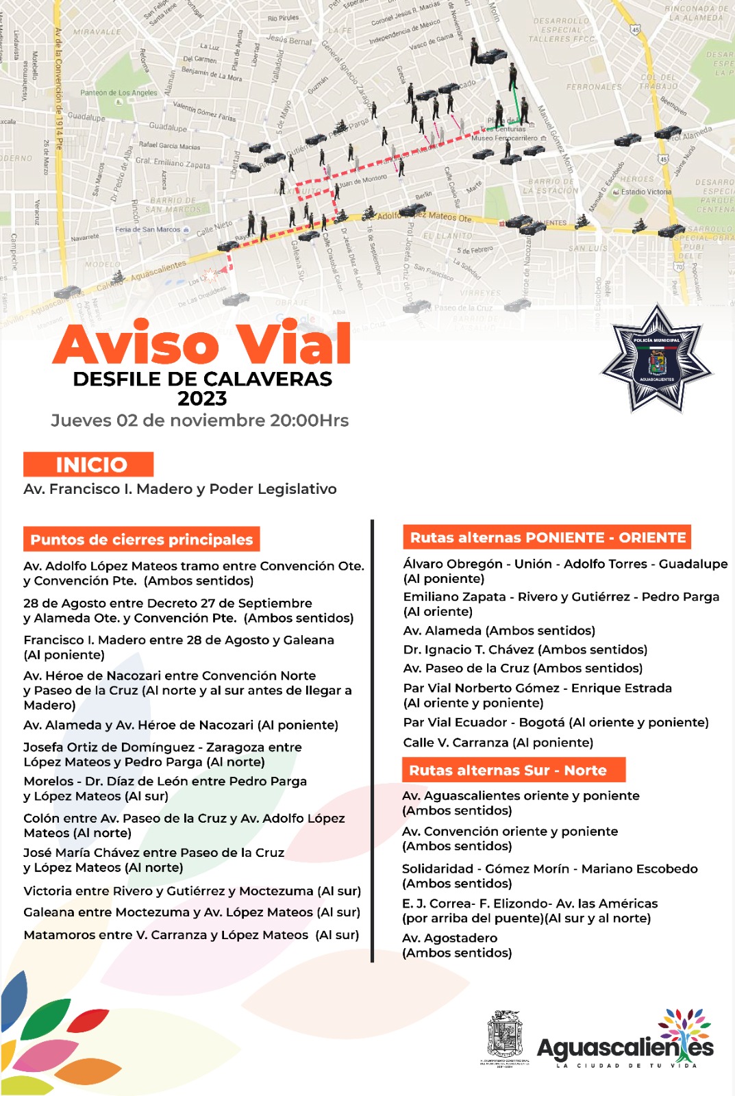 Con motivo del «Desfile de las Calaveras», la Secretaría de Seguridad Pública Municipal de Aguascalientes (SSPM) desplegará un operativo vial el jueves 2 de noviembre de 2023, que incluirá cierres en diferentes puntos de la ciudad.