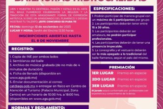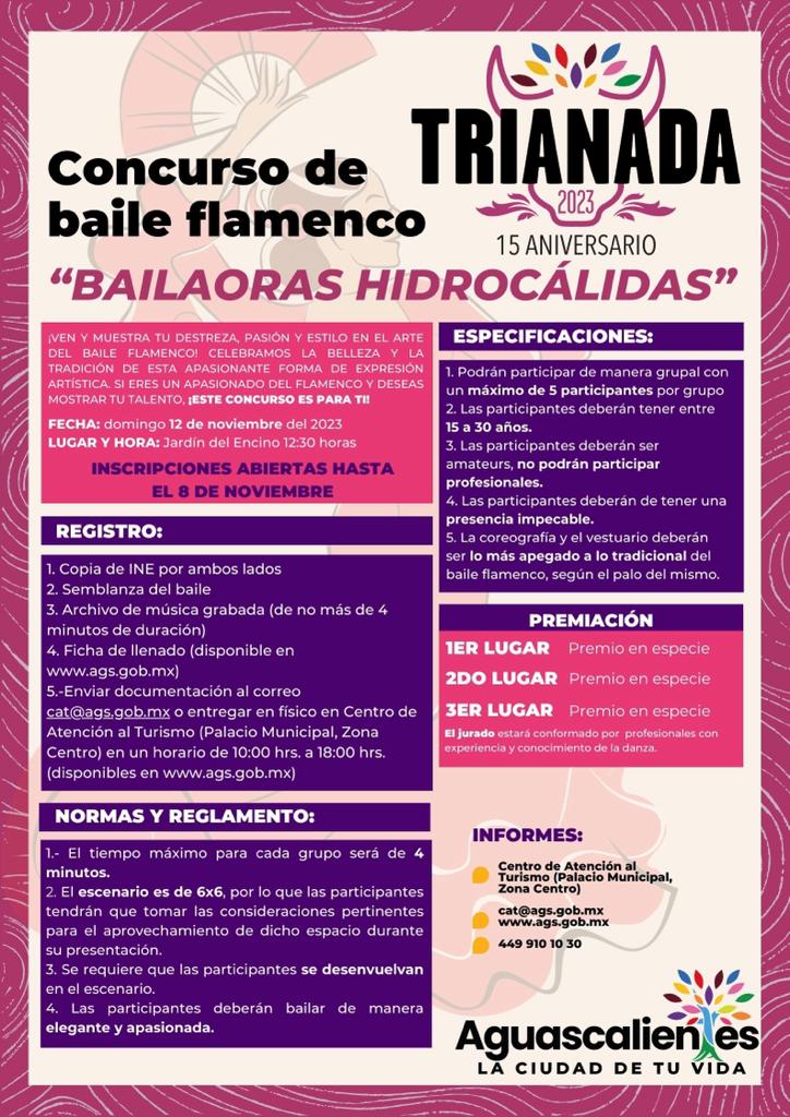 Concurso de Baile Flamenco Bailaoras Hidrocálidas: https://www.ags.gob.mx/trianada2023/CONVOCATORIA%20TRIANADA_BAILE%20FLAMENCO.pdf