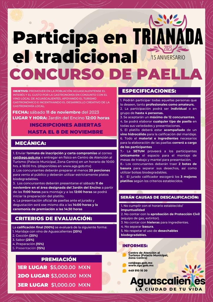 Concurso de Paella: https://www.ags.gob.mx/trianada2023/CONVOCATORIA%20TRIANADA_%20PAELLA.pdf