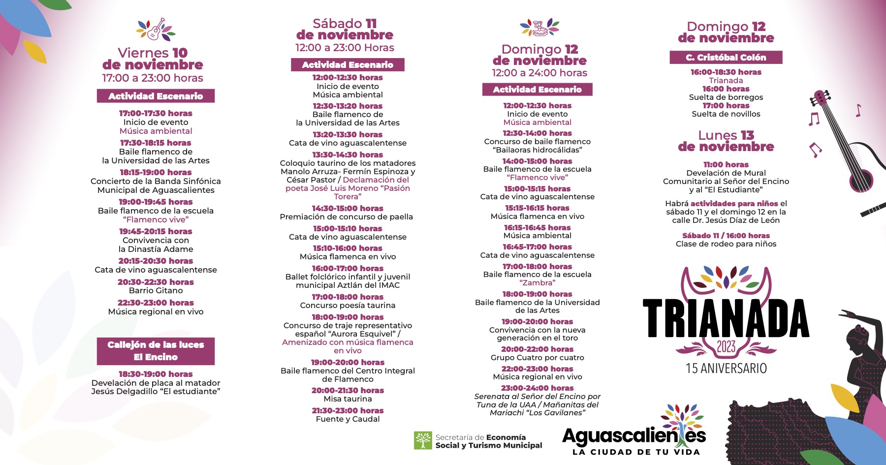 Adriana Marcela Ávila Hernández, coordinadora de la Trianada, comentó que para esta edición especial, se ha preparado un programa lleno de actividades que representan la esencia de este evento, en donde personas de todas las edades podrán disfrutar de eventos culturales y gastronómicos, como baile flamenco, trajes típicos españoles, suelta de novillos, actividades para niños, cata de vinos hidrocálidos, paella gigante y música a cargo de Fuente y Caudal, Cuatro por Cuatro y Barrio Gitano.