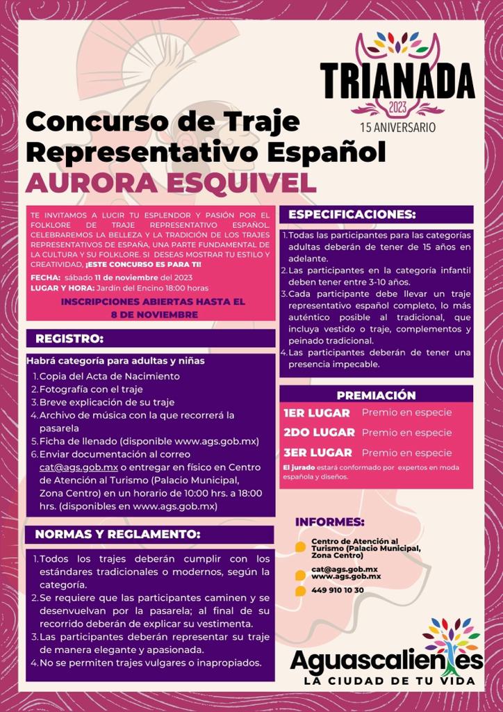 Concurso de Traje Típico Español: https://www.ags.gob.mx/trianada2023/CONVOCATORIA%20TRIANADA_TRAJE%20ESPANOL.pdf