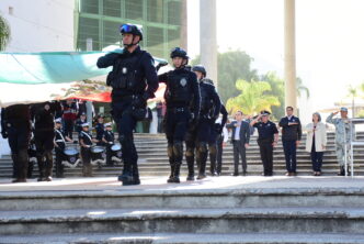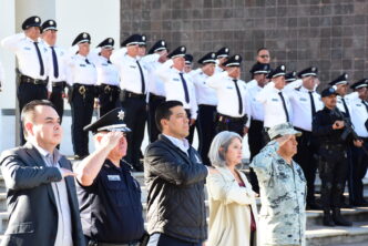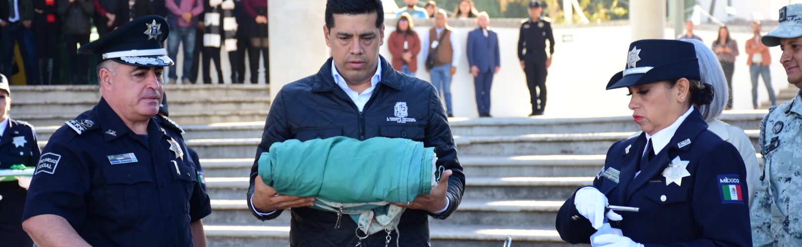 Posteriormente con el nuevo lábaro patrio, se llevó a cabo el izamiento en la explanada del Complejo de Seguridad Pública Municipal.