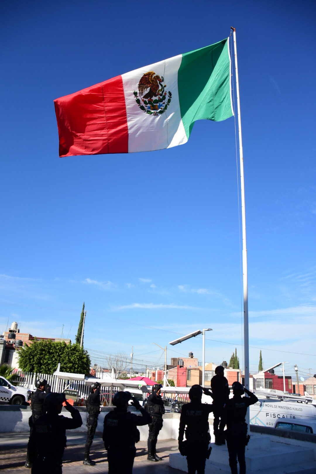Como parte de esta ceremonia, la Bandera Nacional que ha sufrido deterioro por el paso del tiempo se reemplaza por una nueva que fue entregada oficialmente por parte del presidente municipal a la Secretaría de Seguridad Pública Municipal de Aguascalientes.