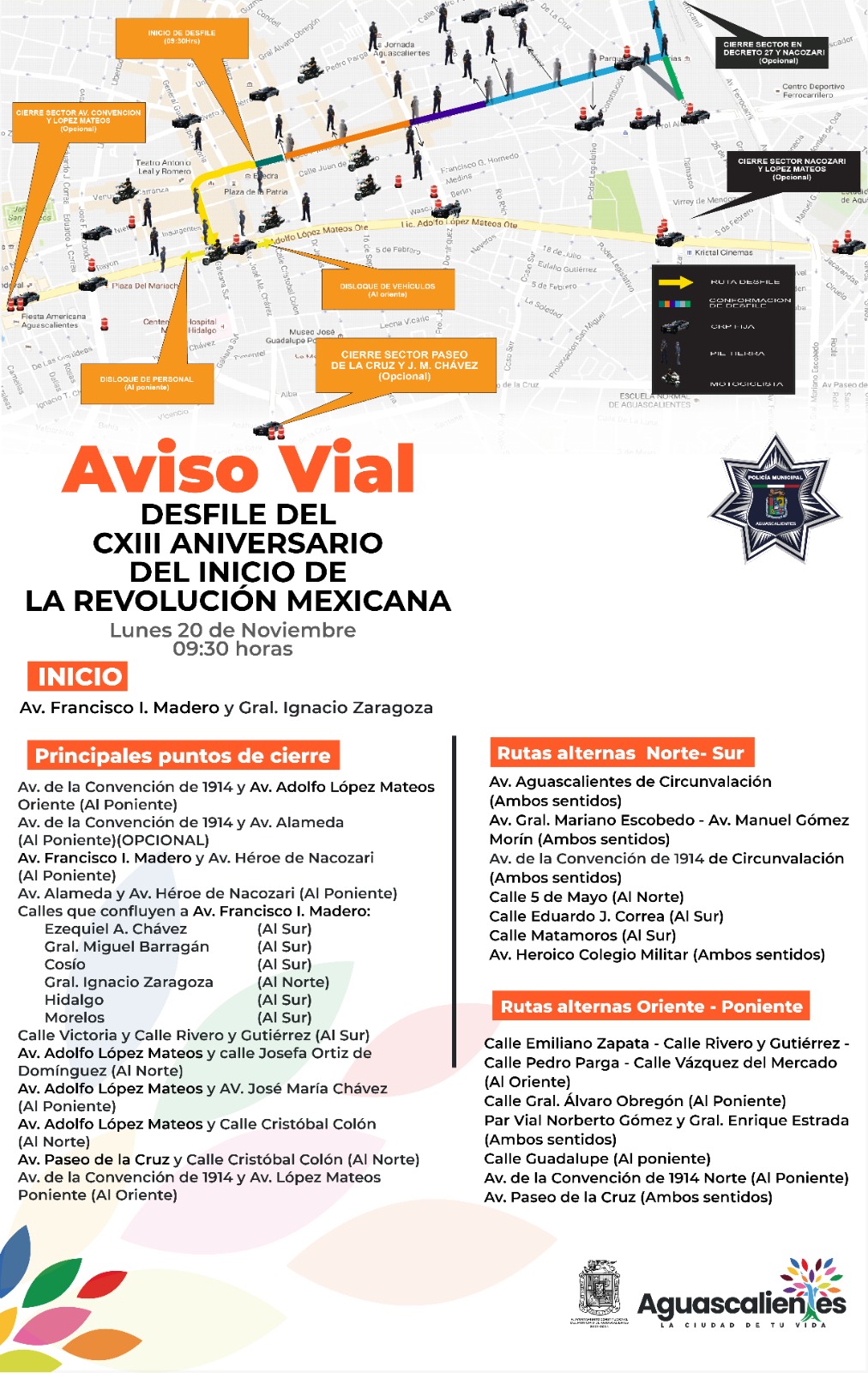 Antonio Martínez Romo invitó a la ciudadanía a disfrutar el desfile con motivo del inicio de la Revolución Mexicana de 1910, con orden, respeto y en un ambiente familiar. Reiterando que en todo momento habrá vigilancia y coordinación entre la Policía Municipal de Aguascalientes y los cuerpos de Protección Civil, Bomberos y Cruz Roja.