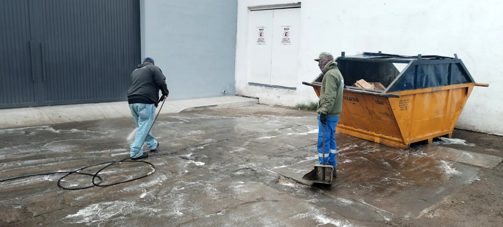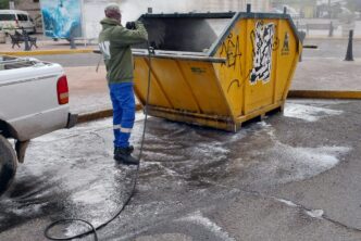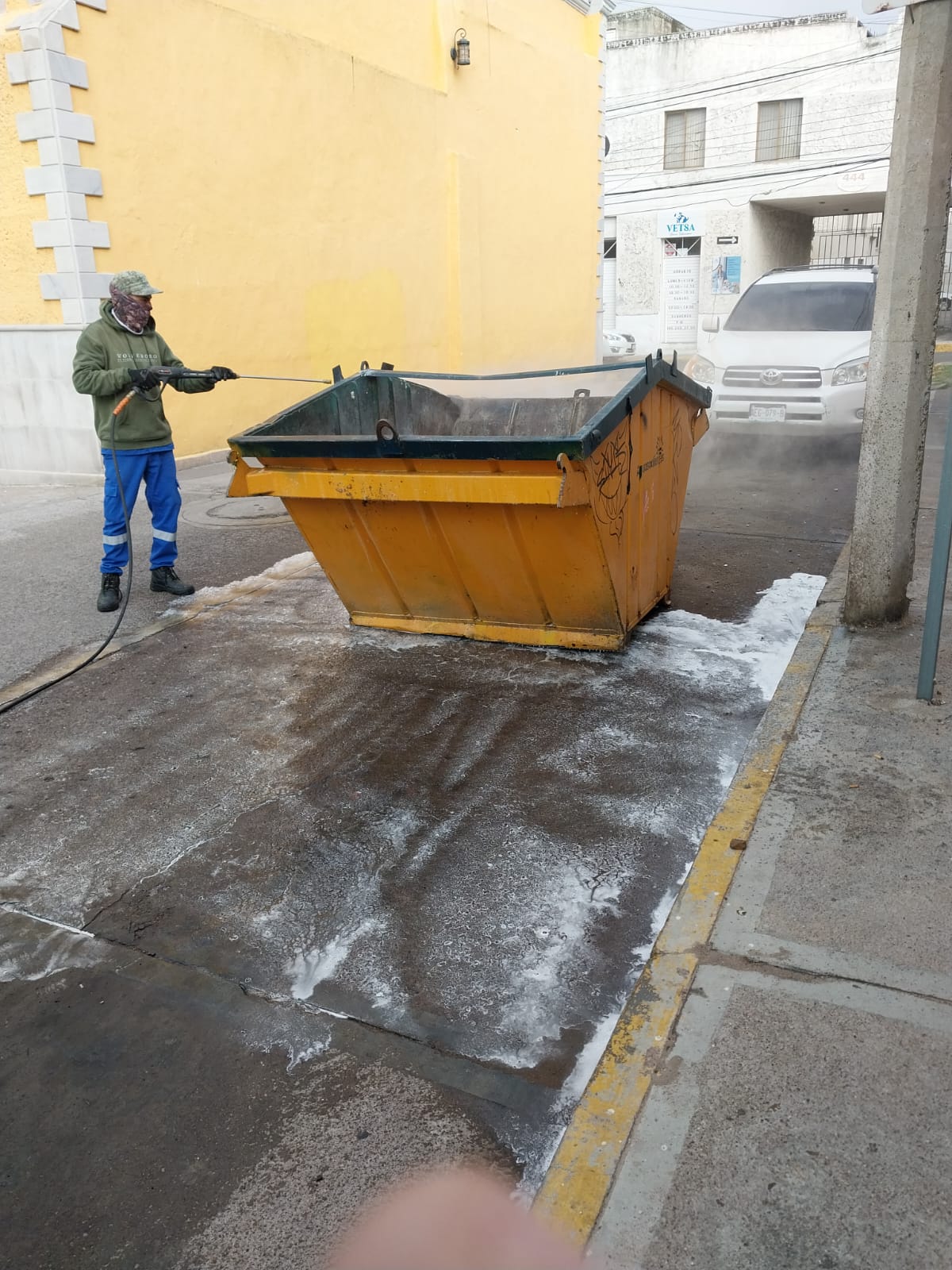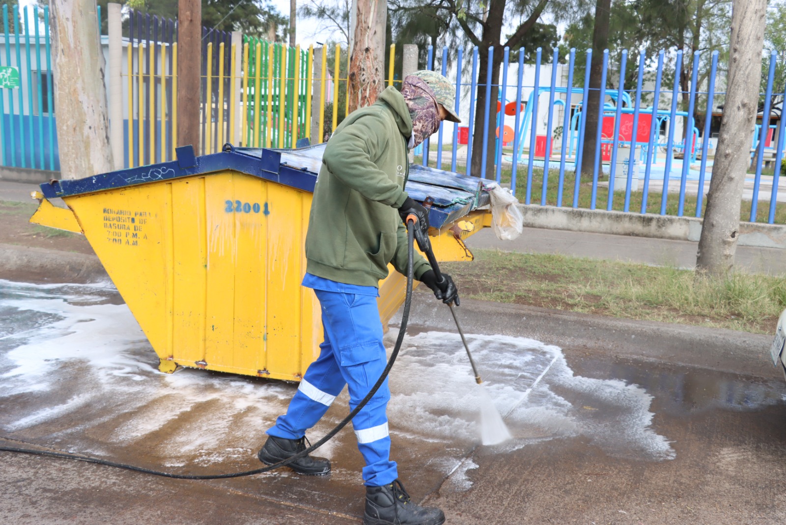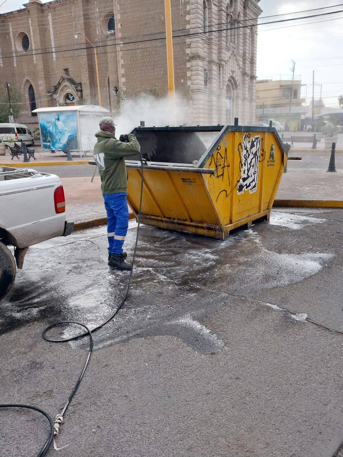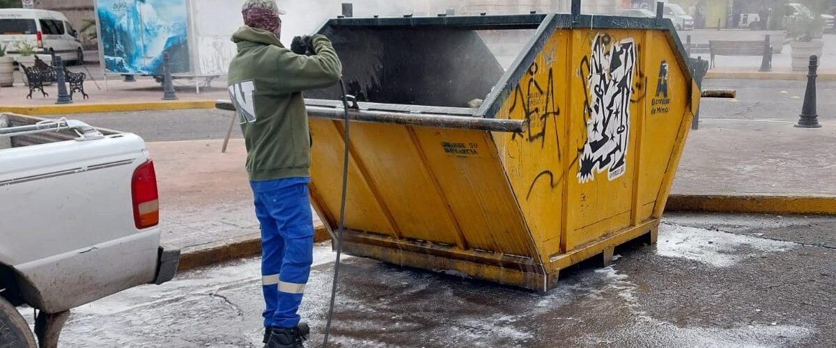 Carlos España Martínez, titular de la Secretaría de Servicios Públicos, comentó que el personal va realizando la limpieza de contenedores en distintas zonas del municipio, utilizando pistolas de presión de agua y productos biodegradables como desengrasante, detergente y desodorante.