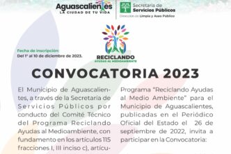 El Municipio de Aguascalientes a través de la Secretaría de Servicios Públicos invita a participar, del 01 al 10 de diciembre, en la Convocatoria 2023 del programa “Reciclando ayudas el medio ambiente”, que busca empresas dedicadas al acopio de material reciclable para dar el correcto destino de los residuos sólidos urbanos.